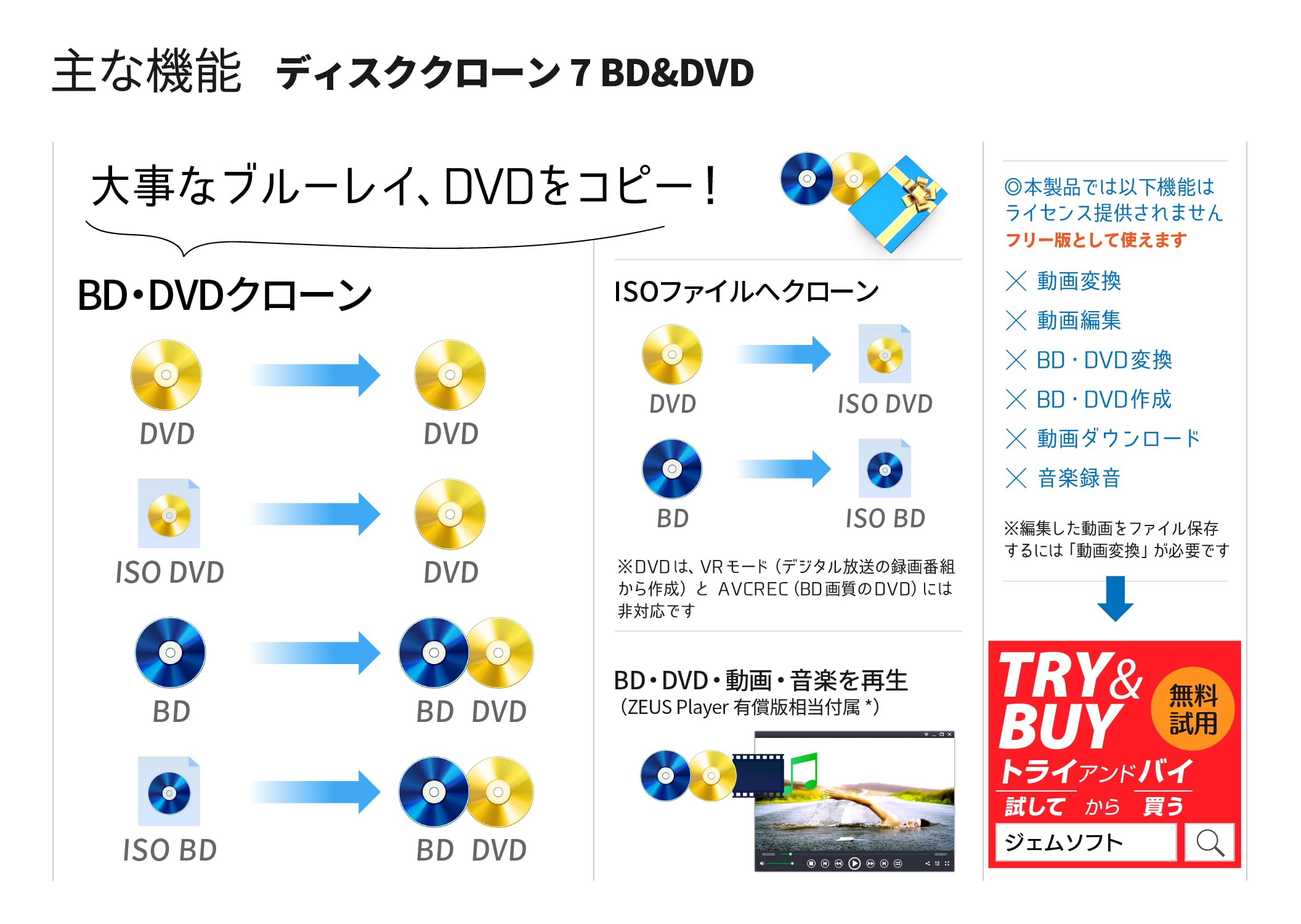 ブルーレイ・DVDクローン(ブルーレイを複製、DVDに圧縮して複製。DVDを複製。片面2層から片面1層へ圧縮して複製。ISOイメージにも対応)