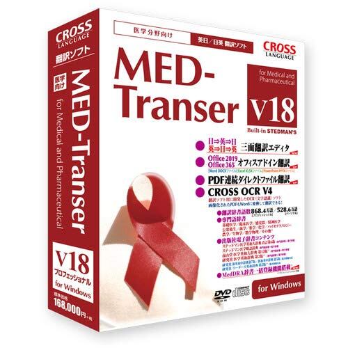 医学専用翻訳ソフト『MED-Transer V18』プロフェッショナル版。総辞書数868.4万語(英日:372万語、日英:496.4万語)収録。医学基本語辞書409万語、医学用専門語辞書459.4万語を収録。医学辞書の権威「ステッドマン医学英和大辞典改訂第6版」を翻訳辞書化した「ステッドマン専門語辞書第6版」18.1万語、「ステッドマン略語」4.1万語収録。英文作成に便利な「日⇒英⇒日 三面翻訳エディタ」に加えて、「英⇒日⇒英 三面翻訳エディタ」と「PDF連続ダイレクトファイル翻訳機能」を新搭載。「CROSS OCR V4」を標準搭載。Windows10、Office2019、Office356、IE11対応。