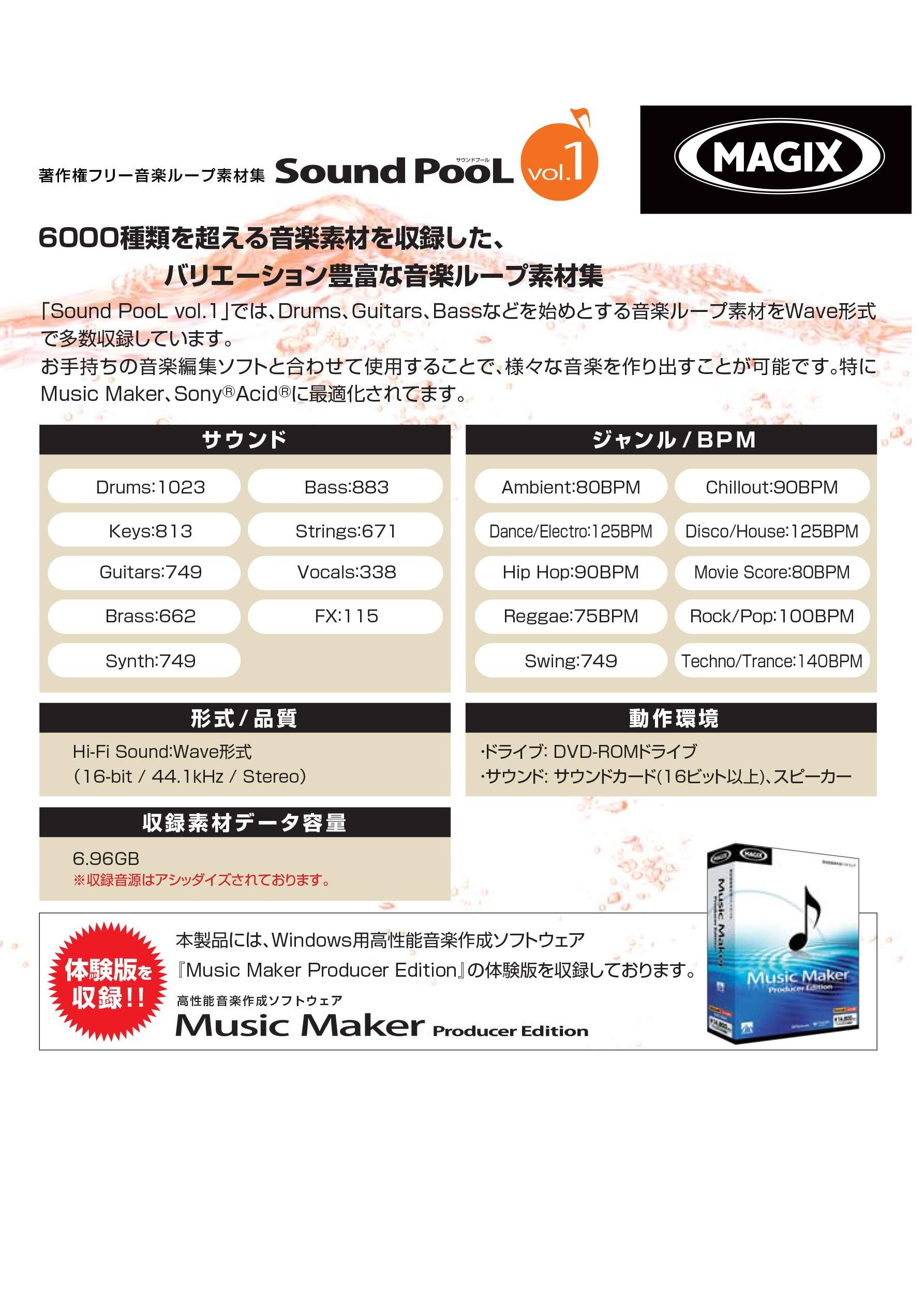 「Sound PooL」は6000種類を超える音楽素材を収録した、バリエーション豊富な音楽ループ素材集です。「Sound PooL vol.1」では、Drums、Guitars、Bassなどを始めとする音楽ループ素材をアシッダイズされたWave形式で多数収録しています。