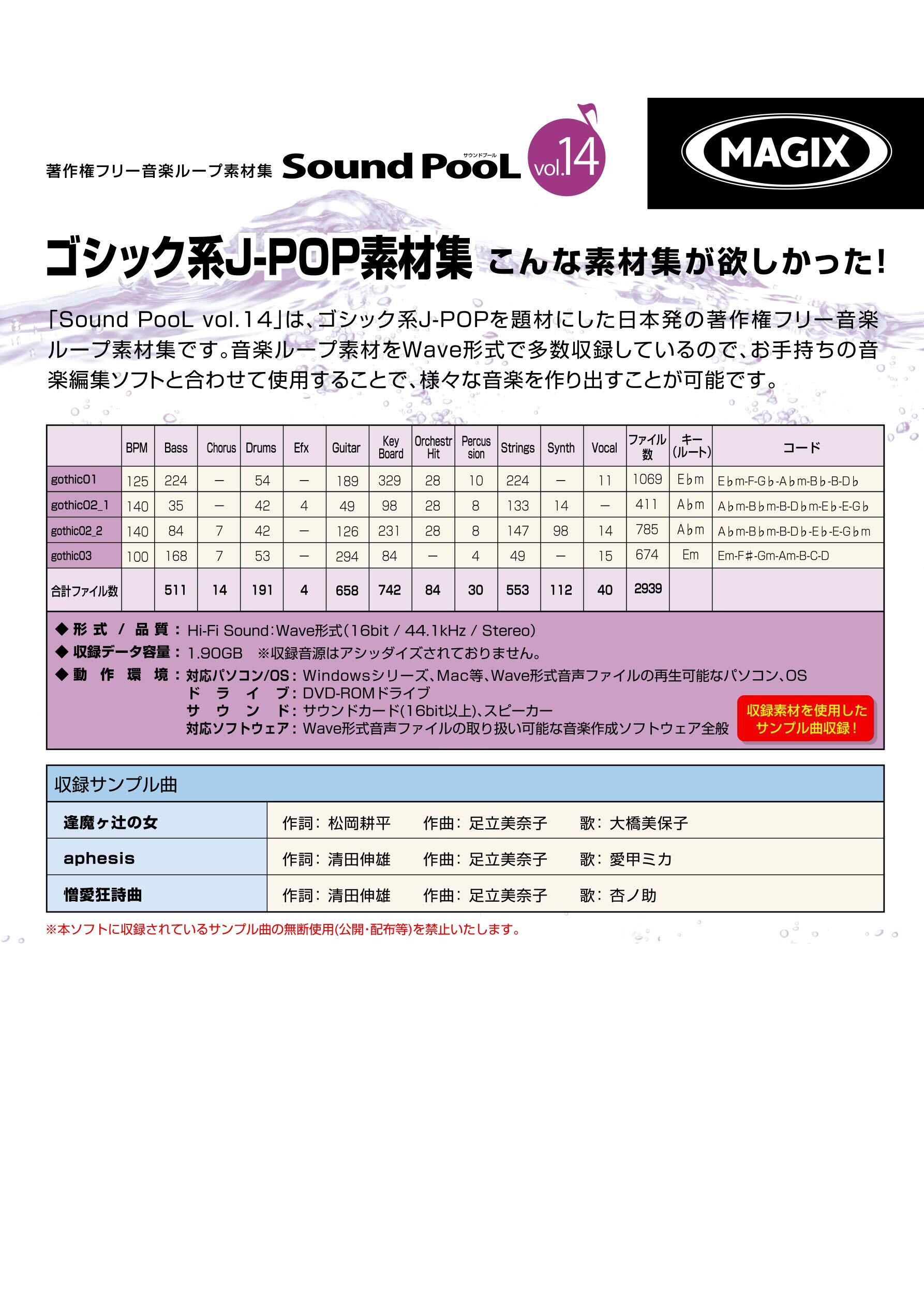 「Sound PooL vol.14」は、ゴシック系J-POPを題材にした著作権フリー音楽ループ素材集です。音楽ループ素材をWave形式で多数収録しているので、お手持ちの音楽編集ソフトと合わせて使用することで、様々な音楽を作り出すことが可能です。