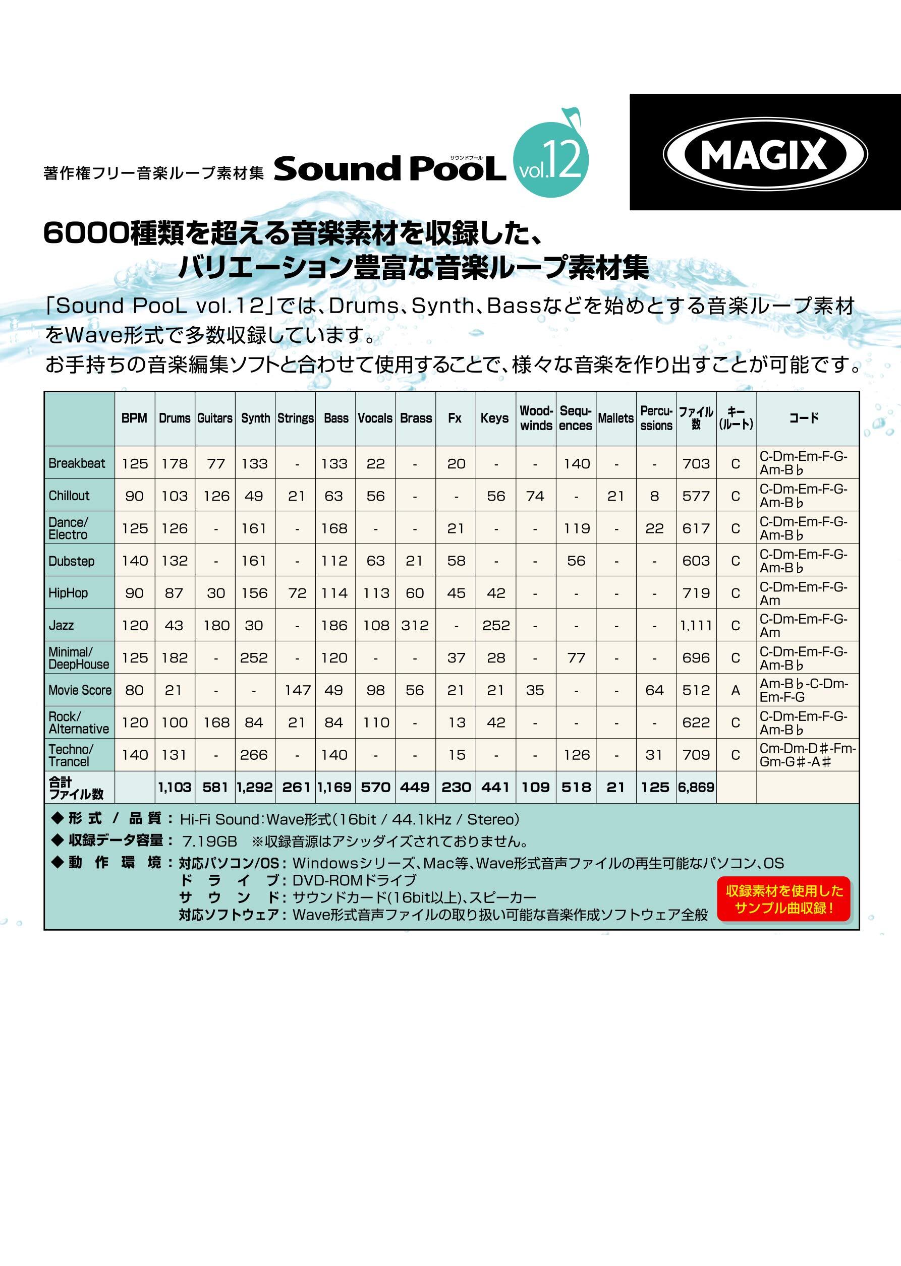 「Sound PooL vol.12」は6000種類を超える音楽素材を収録した、バリエーション豊富な音楽ループ素材集です。Drums、Guitars、Bassなどの音楽ループ素材をWave形式でBreak Beat/Jazz/Dub Step/Rock/Hip Hopなど各ジャンルごとに多数収録しています。ヨーロッパで生まれた、プロも驚愕のサウンドを、是非その耳でお確かめください。