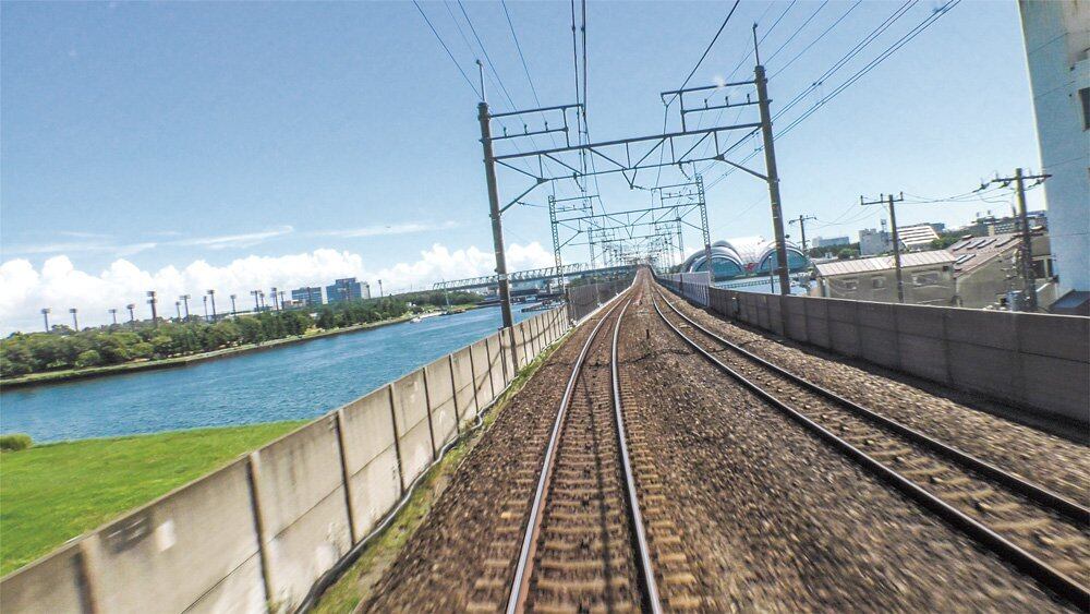 地上に出ると高架に上がり、臨海地区を東へ。工業地帯や東京湾岸の運河を高架橋から眺める。
