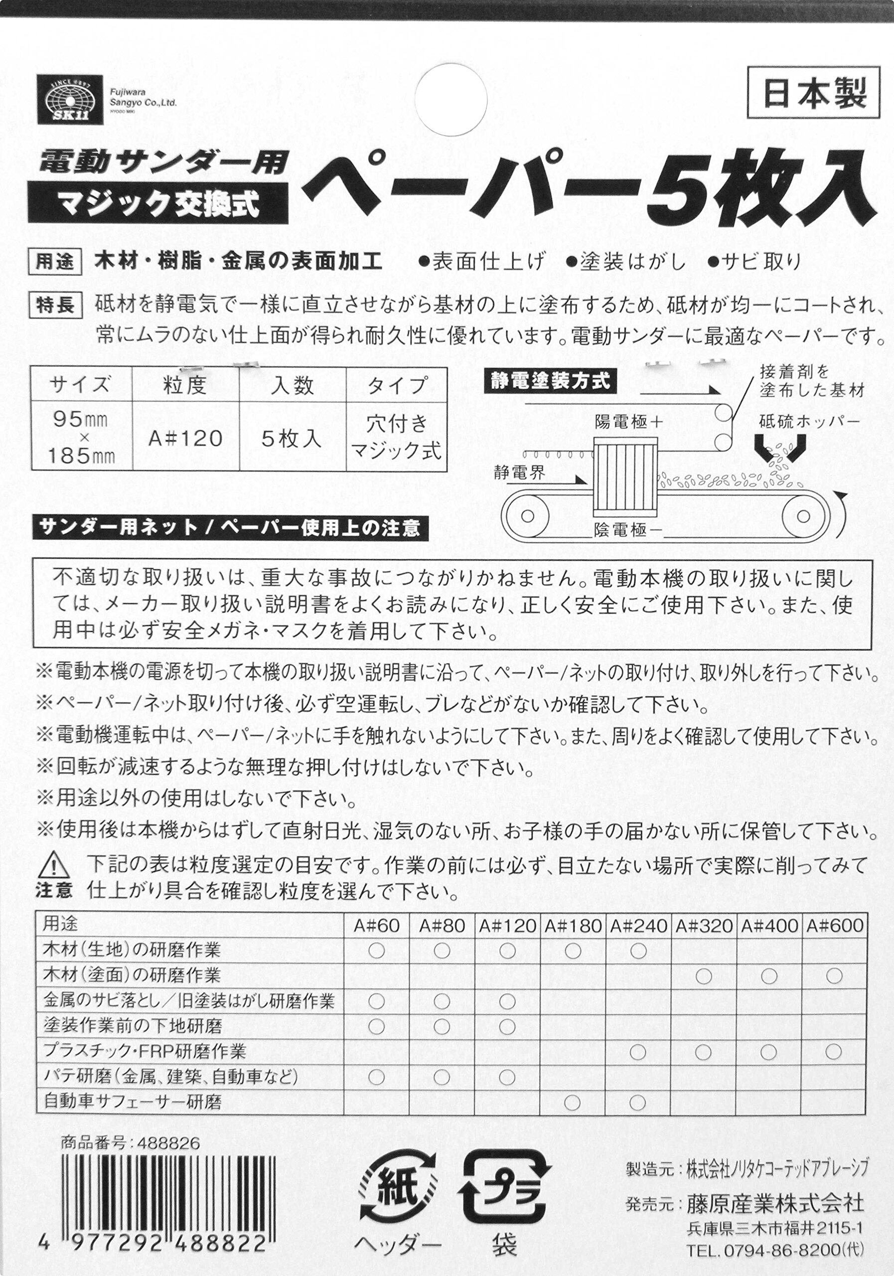・砥材を静電気で一様に直立させながら基材の上に塗布するため、砥材が均一にコートされ、常にムラのない仕上面が得られ耐久性に優れている