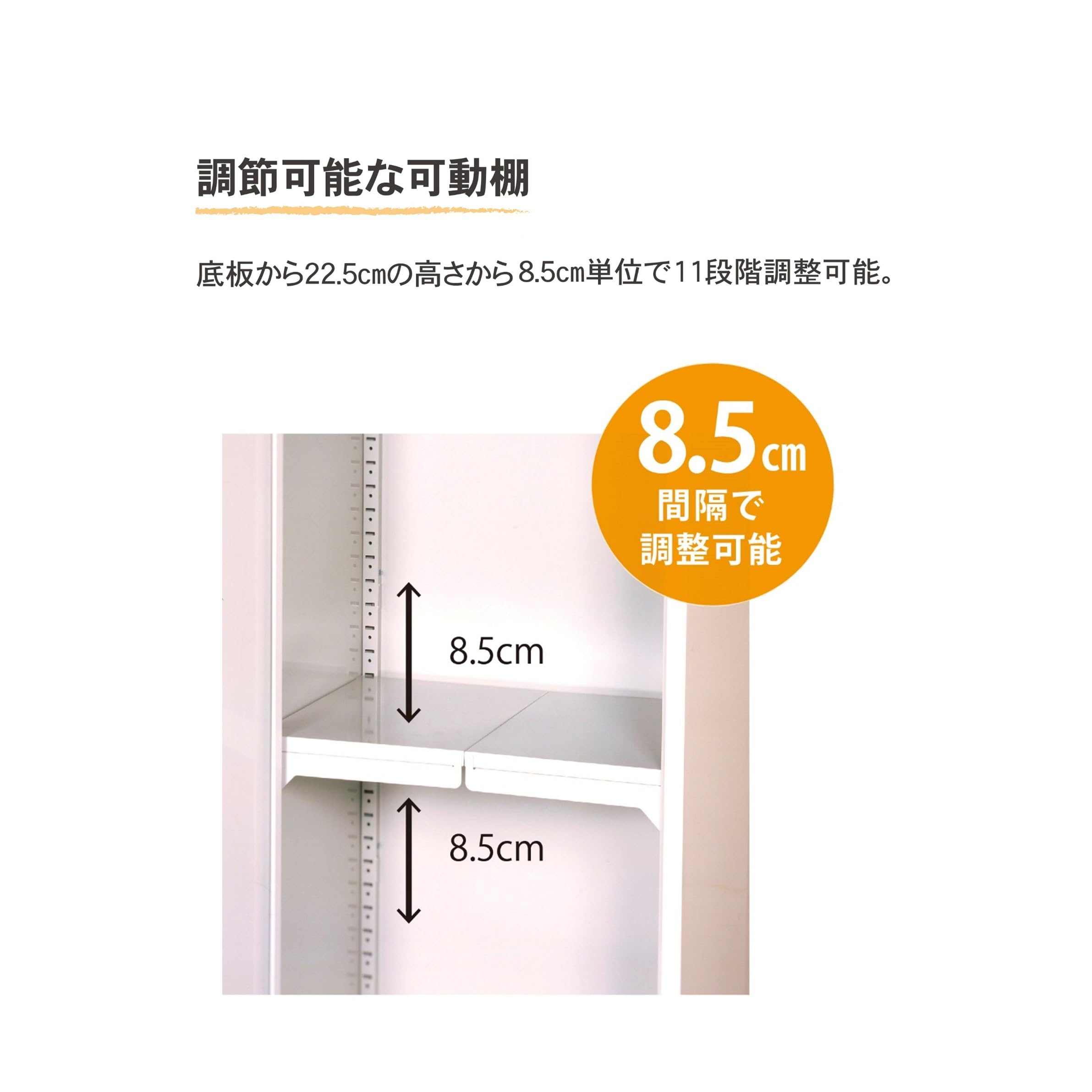 収納用途に合わせて11段階自由に調節可能な棚板付き。