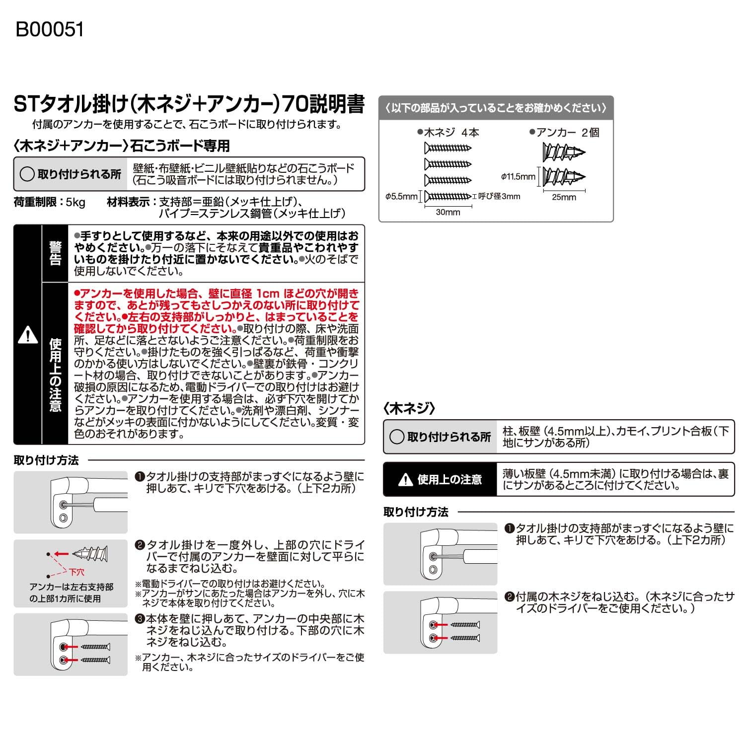 取付方法:木ネジ+アンカー