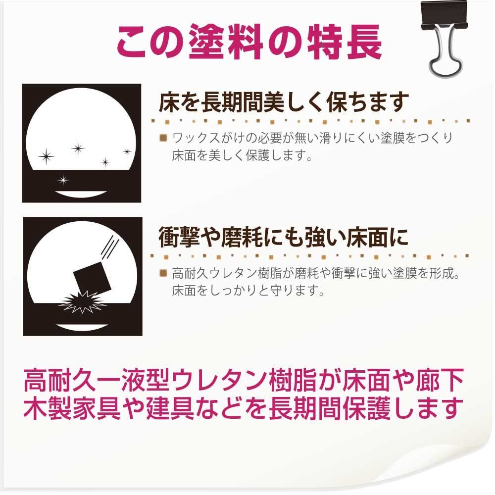 【特長】 ■[耐久性に優れた塗膜]高耐久ウレタン樹脂が、摩耗や衝撃に強く、耐久性に優れた塗膜を形成します。 ■[ワックスがけ不要]すべりにくく、耐久性に優れ、ワックスがけの必要がありません。