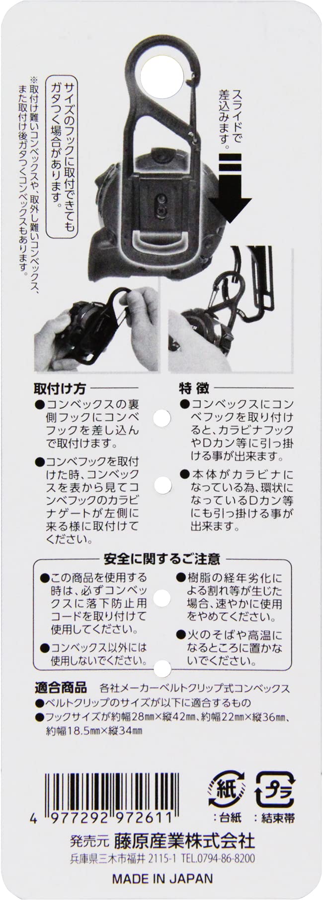 コンベックスに取付けるだけで腰回りのカラビナ等に取付が可能になる 【用途】 コンベックスをカラビナ・D環に取り付ける為のホルダー 【特徴】 ・コンベックスのベルトクリップに差込み可能 ・カラビナフックやD環等に引っ掛ける事が可能 ・本体がカラビナになっている為、環状になっているD環等にも引っ掛ける事ができる 【注意事項】 ※この商品を使用する際は必ずコンベックスに落下防止コードを取り付けて使用して下さい。 ※コンベックス以外に使用しないでください。