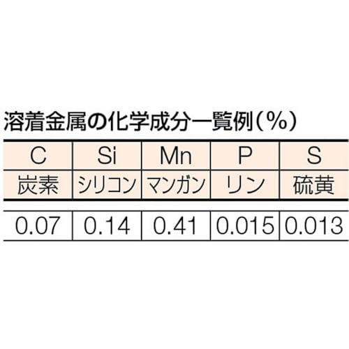 被覆剤中に約30%の鉄粉を含有したライムチタニヤ系溶接棒で、再アーク性に優れ、ビード伸びも良く、断続溶接、すみ肉溶接、タック溶接(仮付け)など全姿勢で溶接できます。