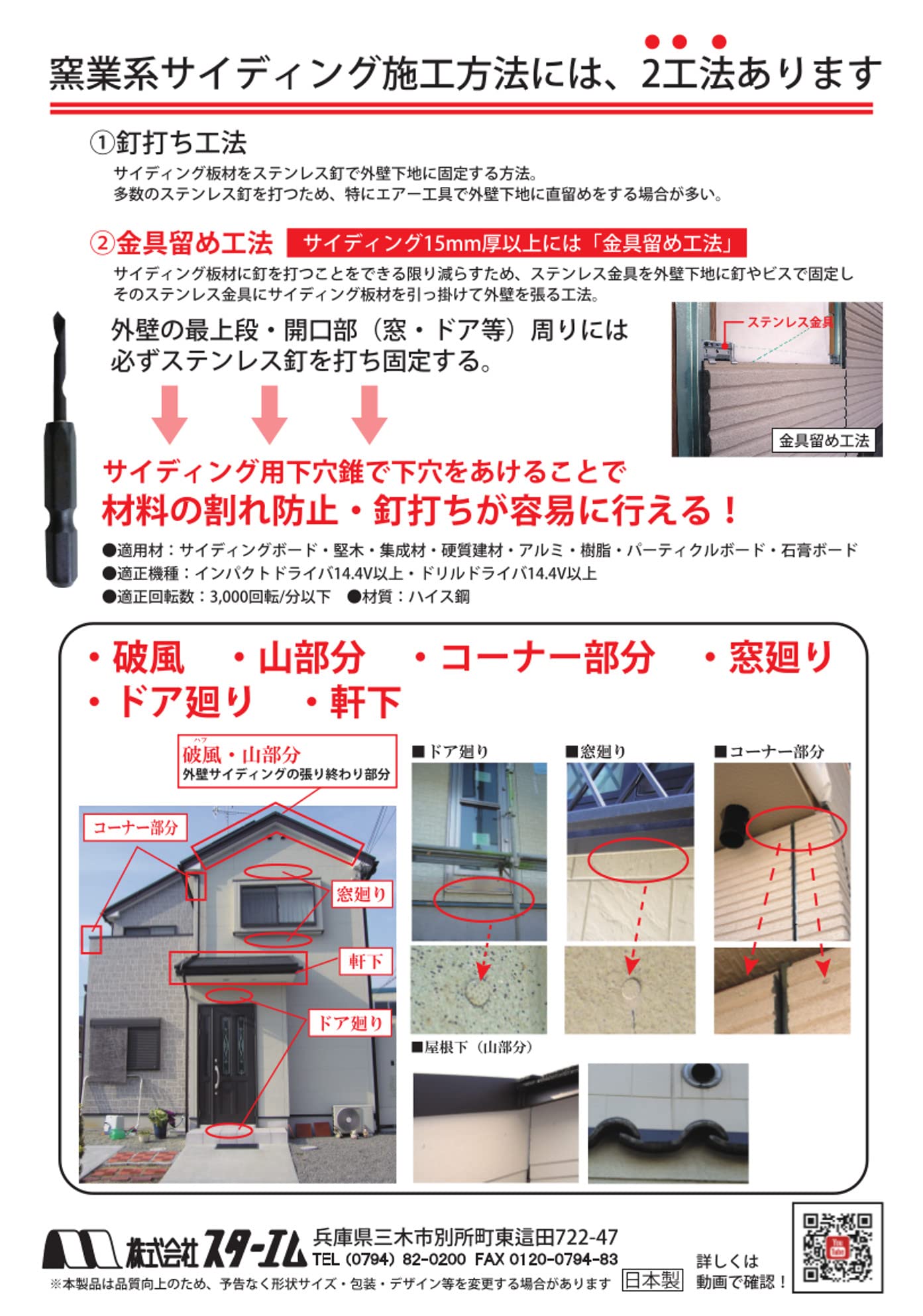 外壁サイディング取付時、釘打ち込み用の下穴あけに向いてます。
