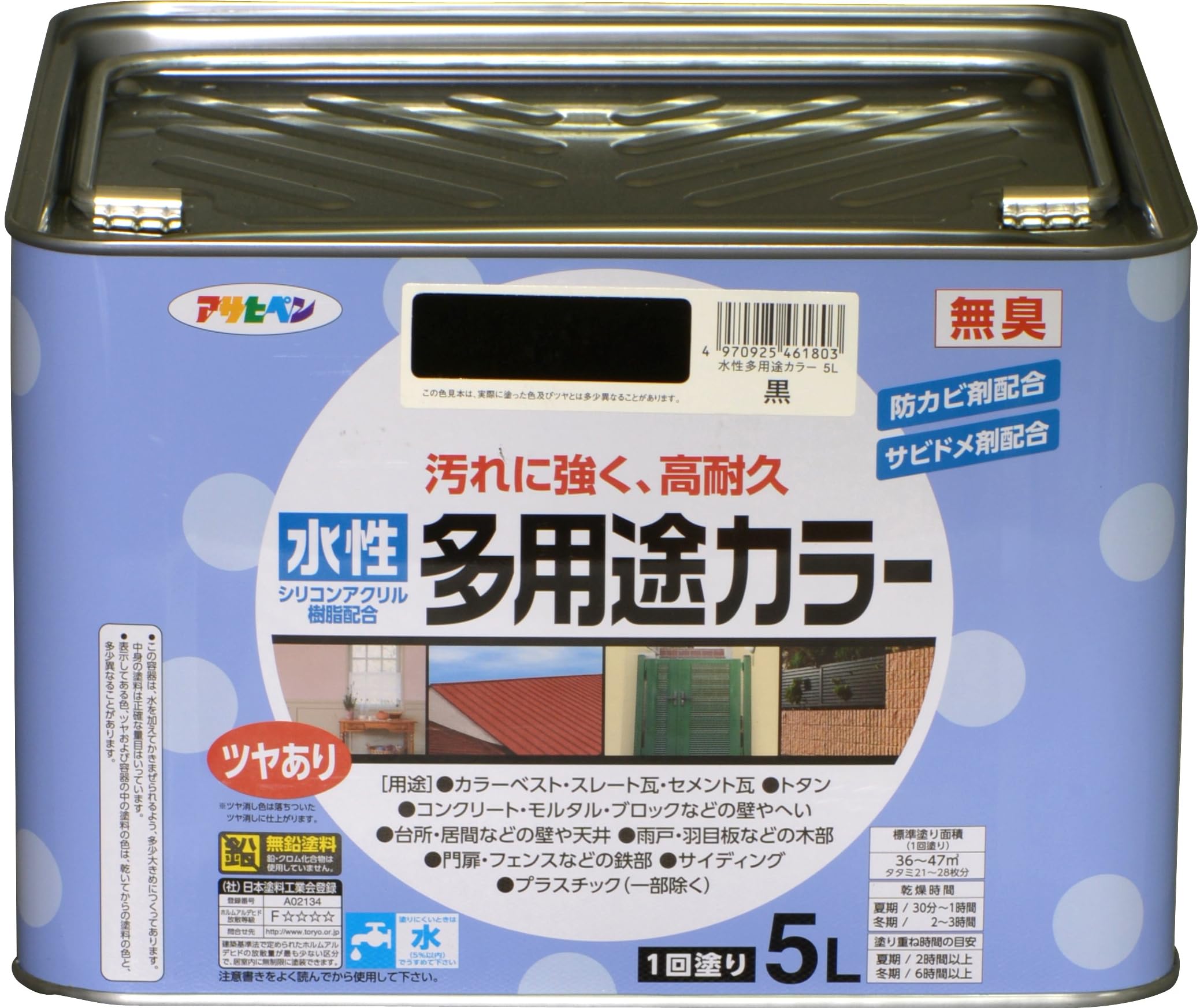 アサヒペン 塗料 ペンキ 水性多用途カラー 5L 黒 水性 多用途 ツヤあり 1回塗り 高耐久 汚れに強い 無臭 防カビ サビドメ剤配合 シックハウス対策品 日本製