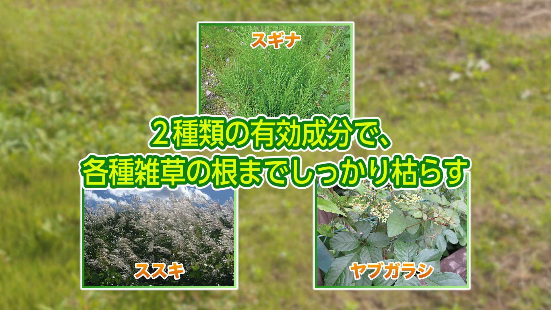 2種類の有効成分で、スギナ・ススキ・ヤブガラシなど各種雑草の葉や茎だけでなく根までスッキリ枯らします。