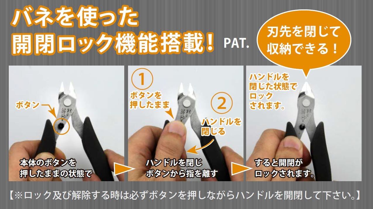 開閉ロック機能付きで刃先を閉じて収納できる。