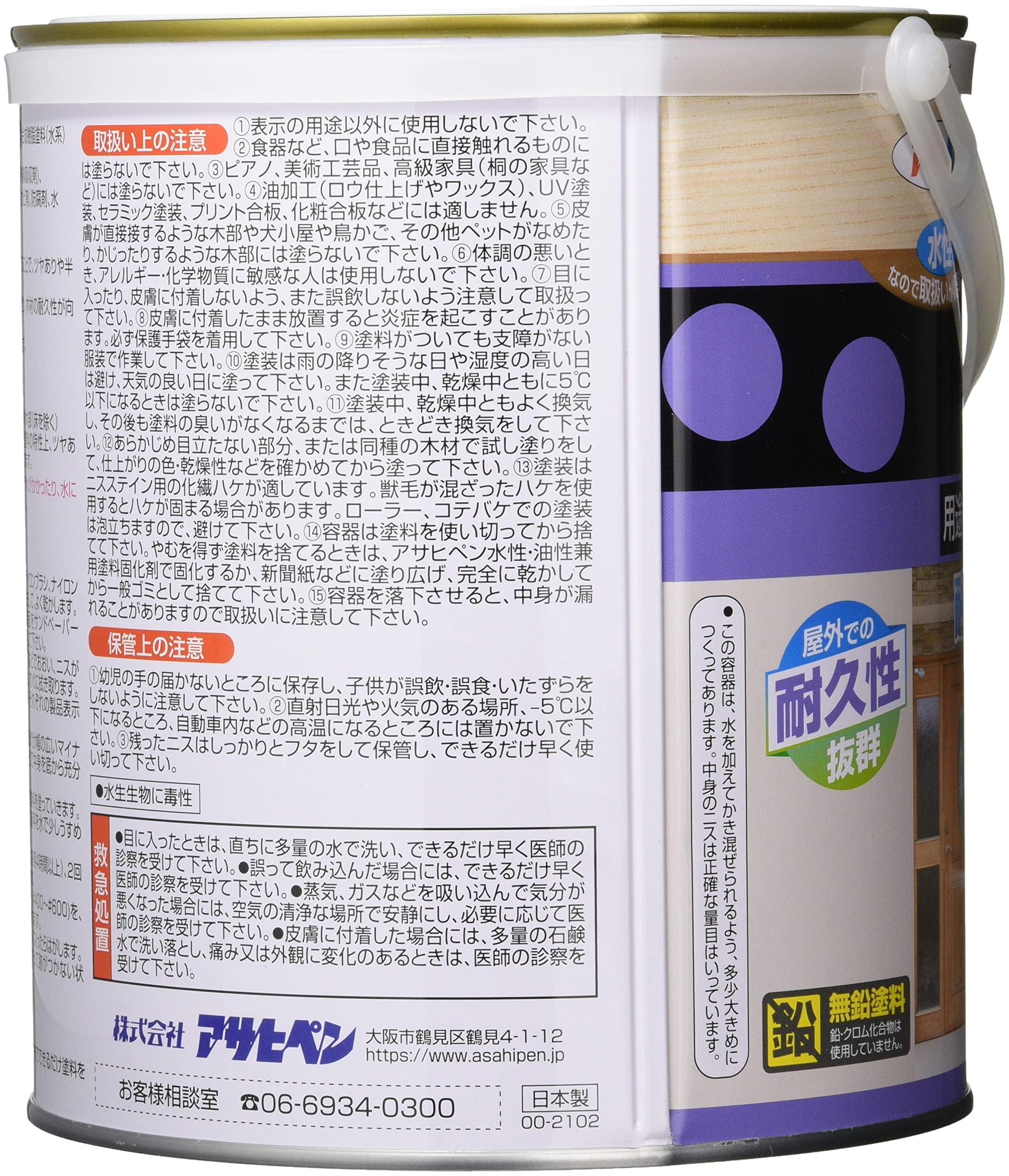 注意事項:●表示の用途以外には使用しないで下さい。 ●テーブルやカウンターの天面、化粧合板、絶えず水がかかったり、水につかる場所、常に湿っている箇所には適しません。 ●食器など、口や食品に直接触れるものには塗らないで下さい。 ●ピアノ、美術工芸品、高級家具(桐の家具など)には塗らないで下さい。 ●油加工(ロウ仕上げやワックス)、UV塗装、セラミック塗装、プリント合板、化粧合板などには適しません。 ●皮膚が直接接するような木部や犬小屋や鳥かご、その他ペットがなめたり、かじったりするような木部には塗らないで下さい。 ●塗装は雨の降りそうな日や湿度の高い日は避け、天気の良い日に塗って下さい。また塗装中、乾燥中ともに5℃以下になるときは塗らないで下さい。 ●塗装はニスステイン用の化繊ハケが適しています。獣毛が混ざったハケを使用するとハケが固まる場合があります。ローラー、コテバケでの塗装は泡立ちますので、避けて下さい。