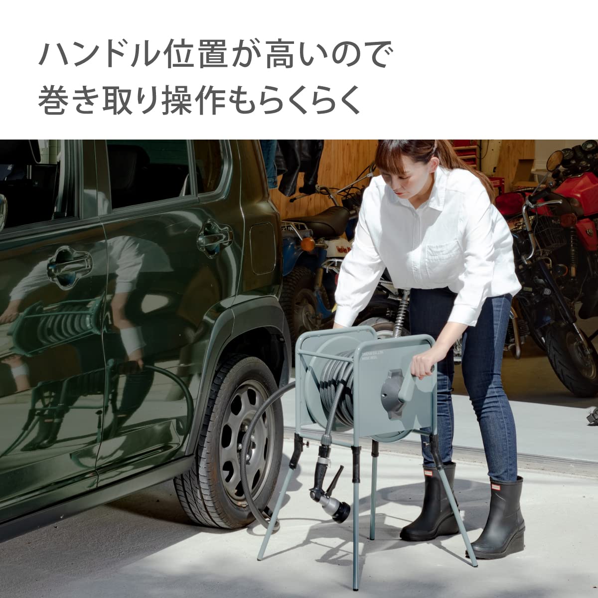 耐久性の高さが特徴的な金属製のホースリールです。ハンドル位置が高いので巻き取り操作がラクです。絡みにくく、ねじれに強いツイスターホースを採用しています。