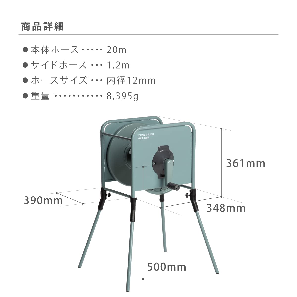 ●適合ホース内径×外径(mm):12×16.5、15×20●使用圧力(MPa):0.7●幅(mm):348●奥行(mm):403●高さ(mm):361●本体色:スレートグリーン●蛇口側ホース長さ(m):1.2●カバー:なし●付属ホース:なし●巻取長さ(適合ホース内径12mm):30mまで●巻取長さ(適合ホース内径15mm):25mまで