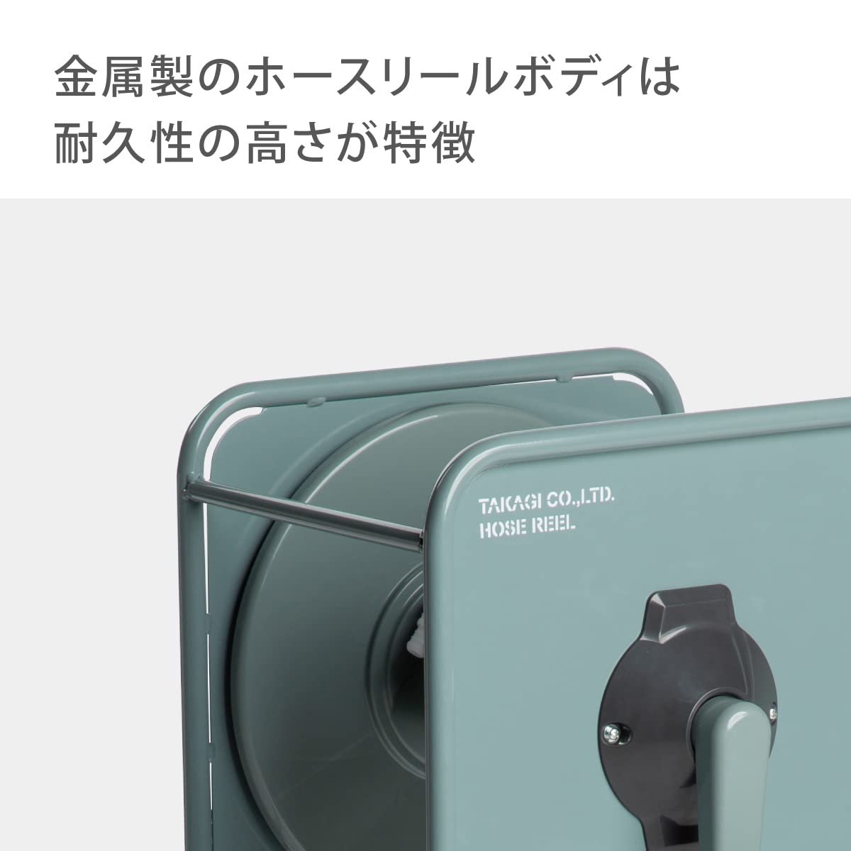 耐久性の高さが特徴的な金属製のホースリールです。こちらの製品はホースリール単品になります。ハンドル位置が高いので巻き取り操作がラクです。