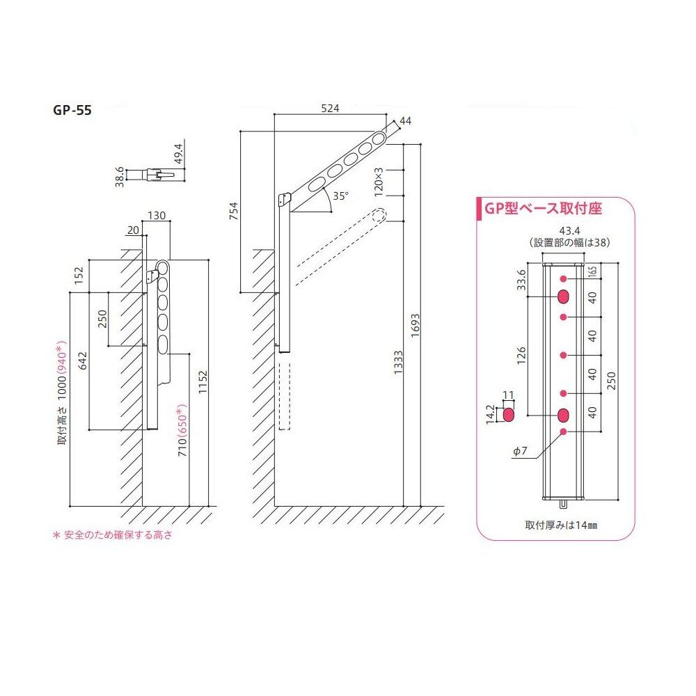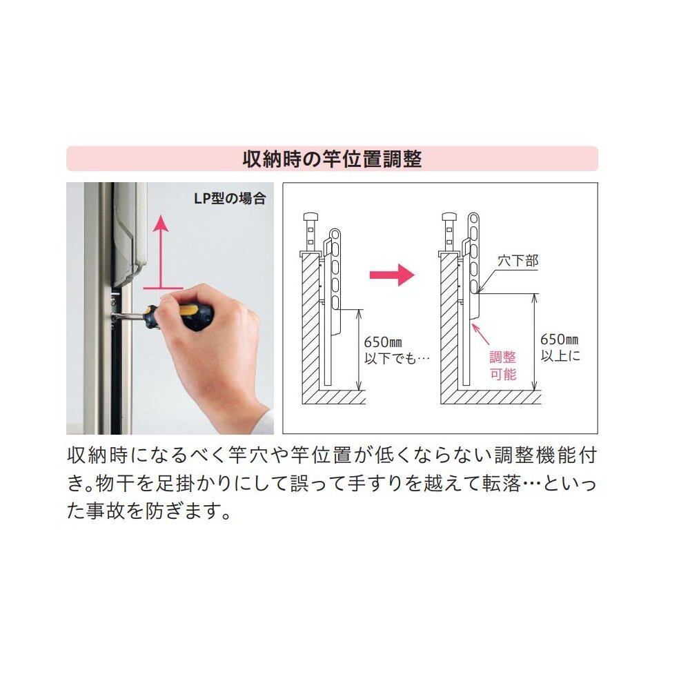 特長:腰壁用物干し。上下可動式のアームで干す高さの調節が可能。※取付パーツ付属無し。ALCへの取付け不可。