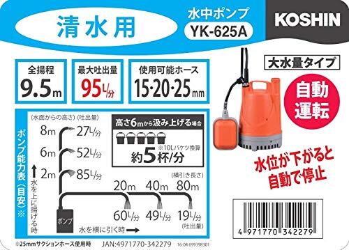 【限定特価】工進(KOSHIN) 清水用 水中 ポンプ YK-625A AC-100V 60Hz 口径 25mm フロート スイッチ 自動 運転 水道ホース 内径 20mm 25mm ホース 使用可能 排水 散水