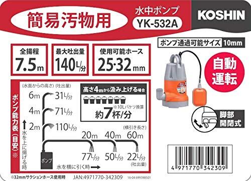 工進(KOSHIN) 簡易 汚物用 水中 ポンプ YK-532A AC-100V 50Hz 口径 32mm フロート スイッチ 自動 運転 内径 25mm 32mm ホース 使用可能 排水 散水