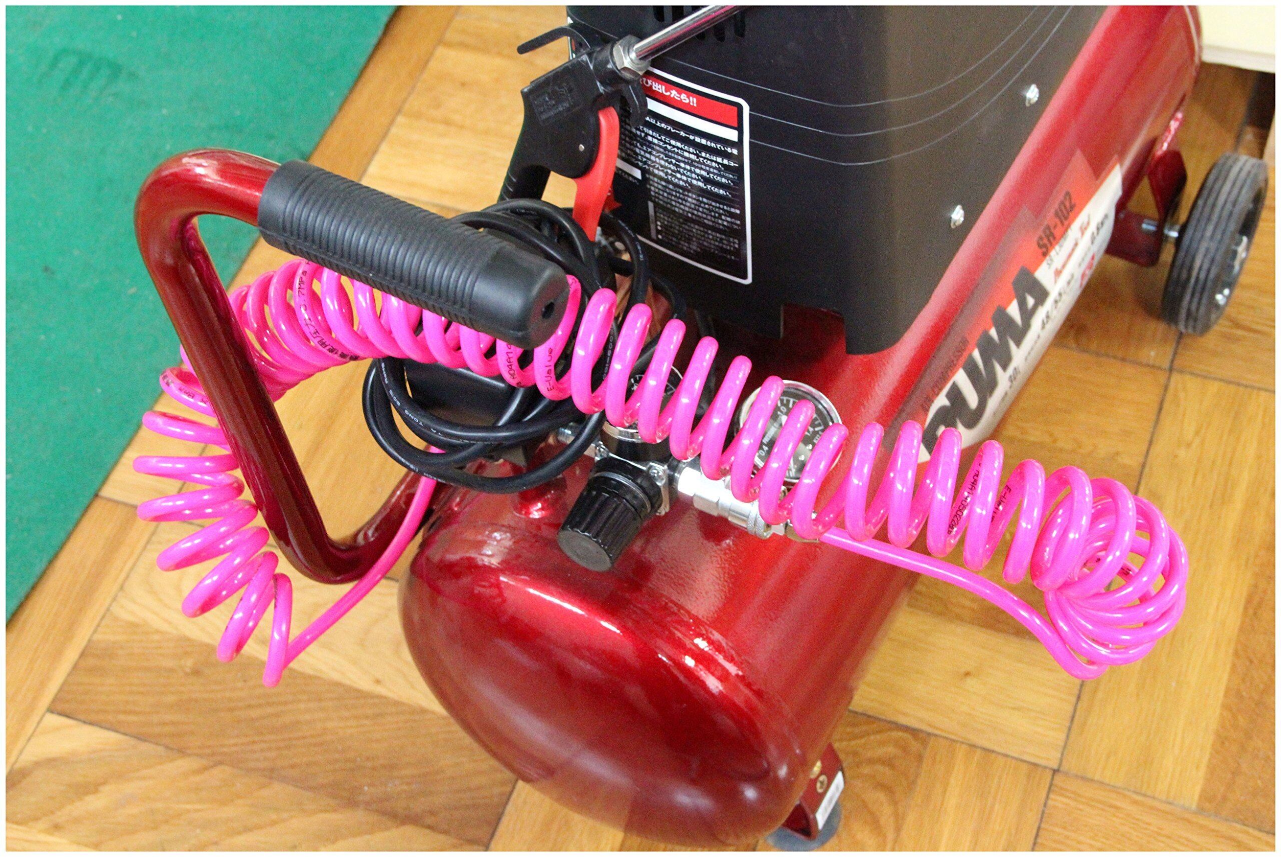 ・伸ばして作業ができ、縮めて収納できる伸縮で邪魔にならないコイル状のエアホース