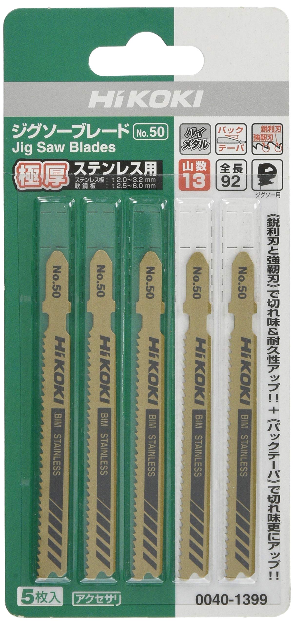 【特価商品】HiKOKI(ハイコーキ) ジグソーブレード No.50 全長92mm 13山/インチ 5枚入 ステンレス用 0040-1399