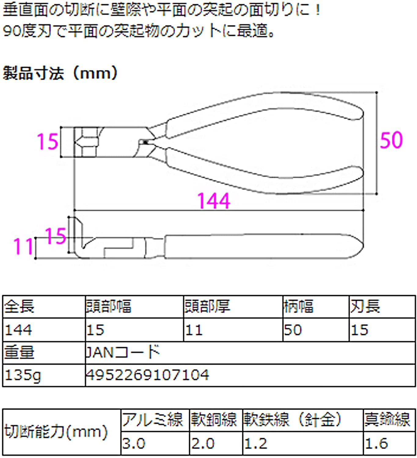 切断能力:アルミ線φ3.0mm、銅線φ2.0mm、軟鉄線φ1.2mm、真鍮線φ1.6mm、樹脂φ5.0mm