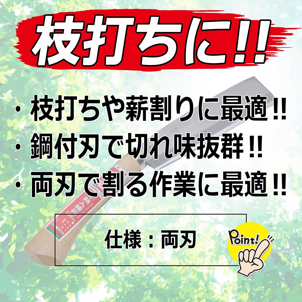 特徴:切れ味抜群の鋼付刃で枝打ち・薪割りが楽々できる