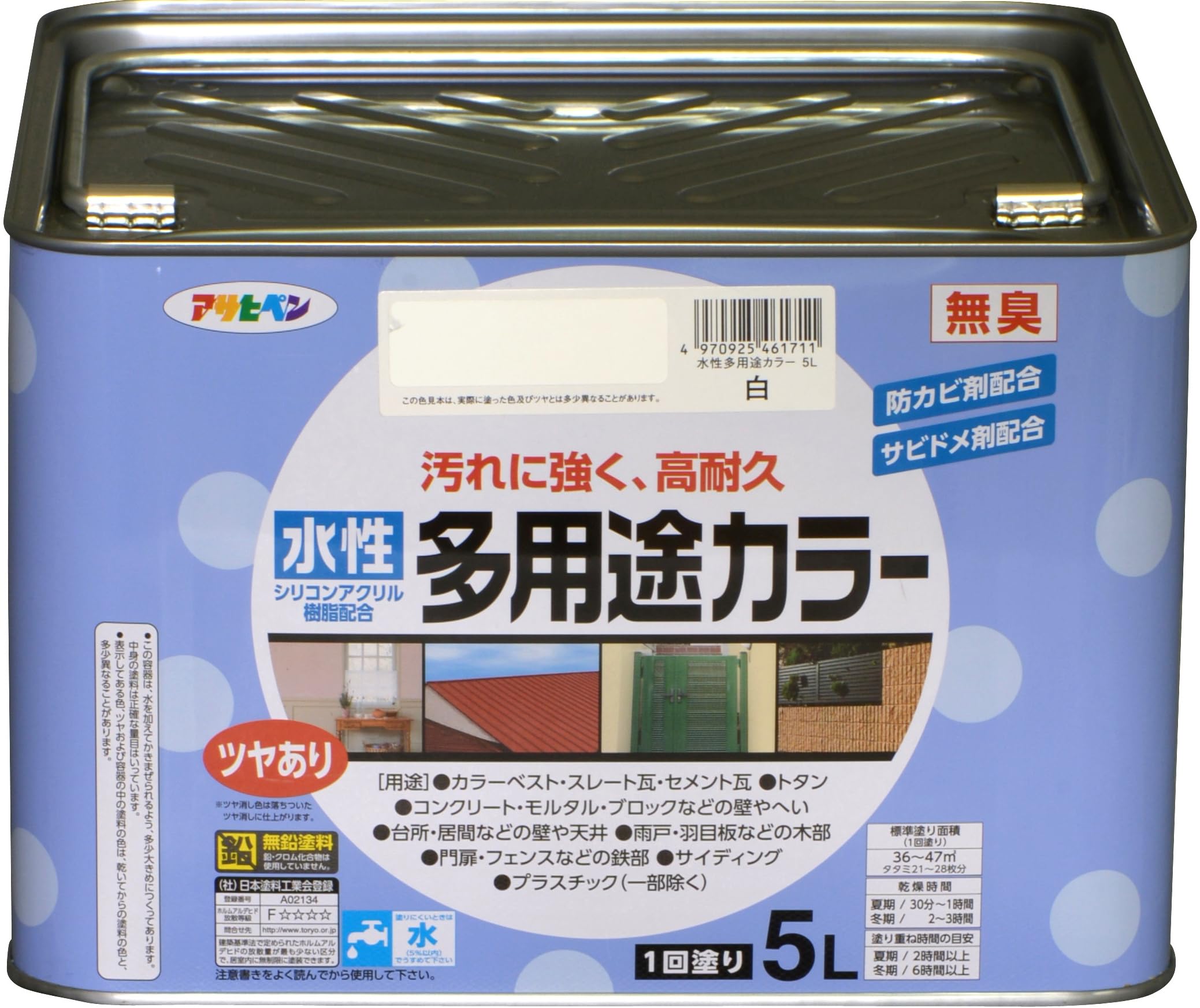 アサヒペン 塗料 ペンキ 水性多用途カラー 5L 白 水性 多用途 ツヤあり 1回塗り 高耐久 汚れに強い 無臭 防カビ サビドメ剤配合 シックハウス対策品 日本製