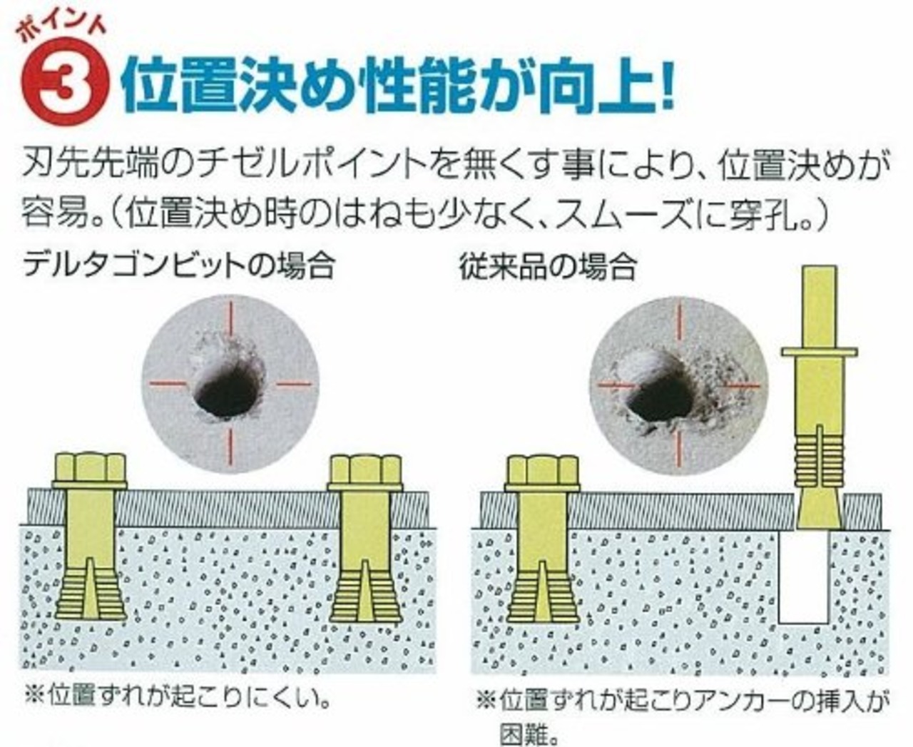 ●コンクリート、ブロック、モルタル、石材、デッキプレート+コンクリートなどへの穴あけ作業に適しています。●3枚刃採用により性能がさらにアップしました。●対鉄筋性能、位置決め性能向上しました。●デッキプレートを貫通します。●真円に近い穴あけを実現しました。●充電ハンマードリルのパワー、回転数に適した3条ねじ形状を採用しています。●デルタ軸タイプ5本入パックです。