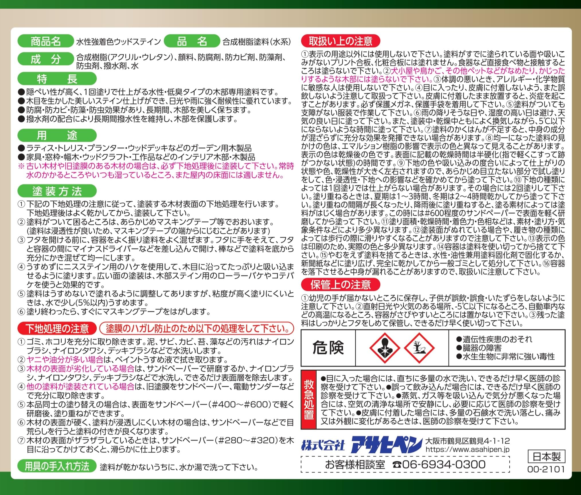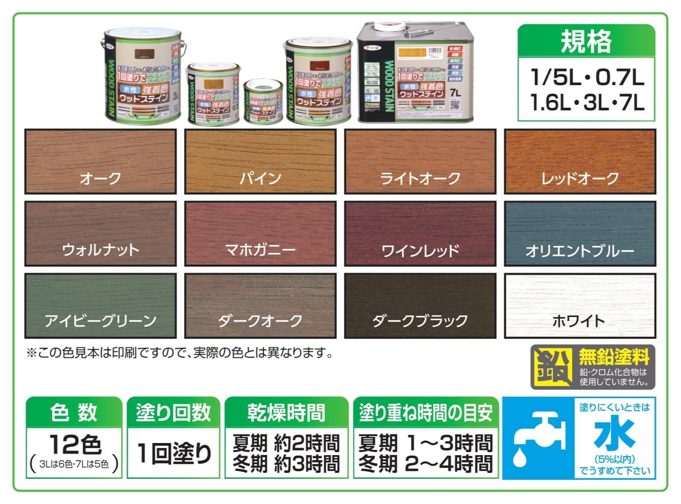 注意事項:●表示の用途以外には使用しないで下さい。塗料がすでに塗られている面や吸いこみがないプリント合板、化粧合板には塗れません。食器など直接食べ物と接触するところは塗らないで下さい。 ●犬小屋や鳥かご、その他ペットなどがなめたり、かじったりするような木部には塗らないで下さい。 ●均一になった塗料の見かけの色は、エマルション樹脂の影響で表示の色と異なって見えることがあります。表示の色は乾燥後の色です。 ●記載の乾燥時間は半硬化(指で軽くこすって跡がつかない状態)の時間です。 ●下地の種類によっては1回塗りでは仕上がらない場合があります。その場合には2回塗りして下さい。塗り重ねるときは、夏期は1~3時間、冬期は2~4時間乾かしてから塗って下さい。塗り重ねの間隔が長くなったり、降雨後に塗り重ねすると、塗る素材によっては塗料がはじく場合があります。この時には#600程度のサンドペーパーで表面を軽く研磨してから塗って下さい。