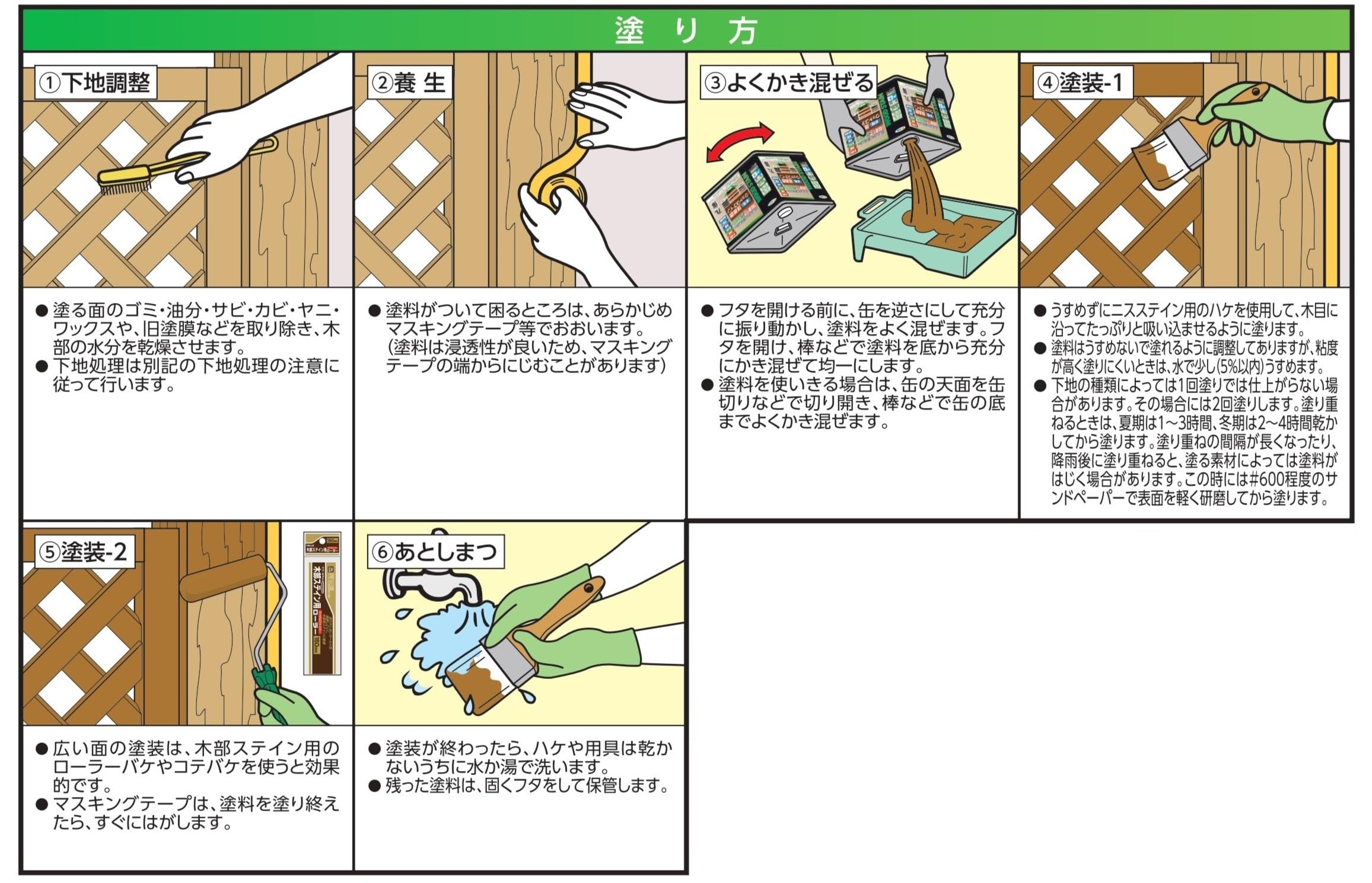 下処理方法:塗膜のハガレ防止のため以下の処理をして下さい。 1. ゴミ、ホコリを充分に取り除きます。泥、サビ、カビ、苔、藻などの汚れはナイロンブラシ、ナイロンタワシ、デッキブラシなどで水洗いします。 2. ヤニや油分が多い場合は、ペイントうすめ液で拭き取ります。 3. 木材の表面が劣化している場合は、サンドペーパーで研磨するか、ナイロンブラシ、ナイロンタワシ、デッキブラシなどで水洗し、できるだけ表面層を除去します。 4. 他の塗料が塗装されている場合は、旧塗膜をサンドペーパー、電動サンダーなどで充分に取り除きます。 5. 本品同士の塗り替えの場合は、表面をサンドペーパー(#400~#600)で軽く研磨後、塗り重ねができます。 6. 木材の表面が硬く、塗料が浸透しにくい木材の場合は、サンドペーパーなどで目荒らしを行うと塗料の付きが良くなります。 7. 木材の表面がザラザラしているときは、サンドペーパー(#280~#320)を木目に沿ってかけておくと、滑らかに仕上ります。