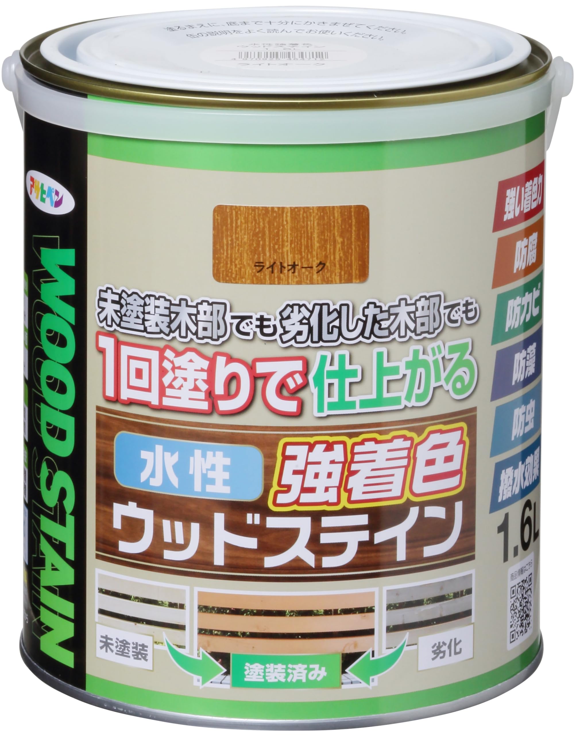 アサヒペン 塗料 ペンキ 水性強着色ウッドステイン 1.6L ライトオーク 水性 木部用 1回塗り 高い隠ぺい性 低臭 はっ水性 防カビ 防虫 防腐 防藻 日本製