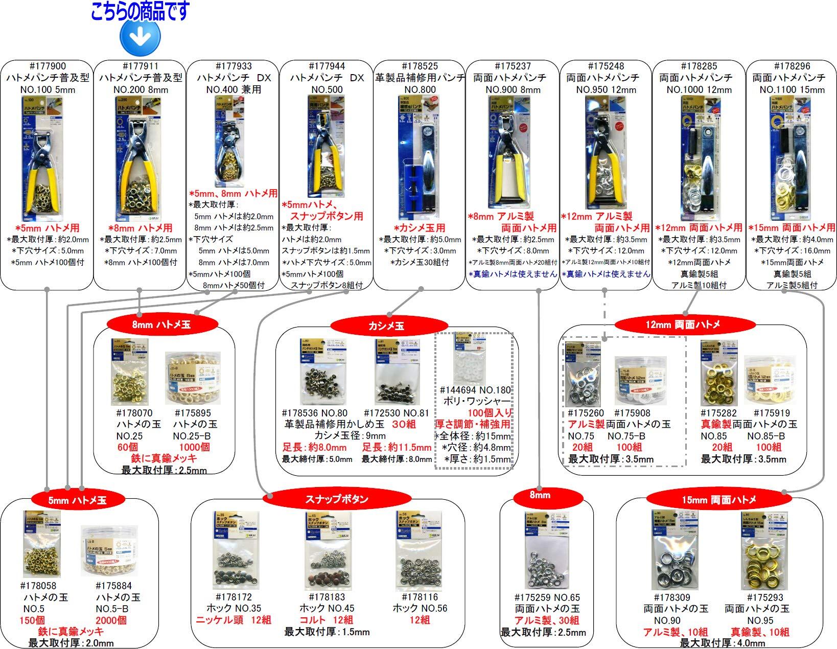 作業中は、誤って幼児がハトメ玉を飲み込まないように、周囲に細心のご注意をお払い下さい