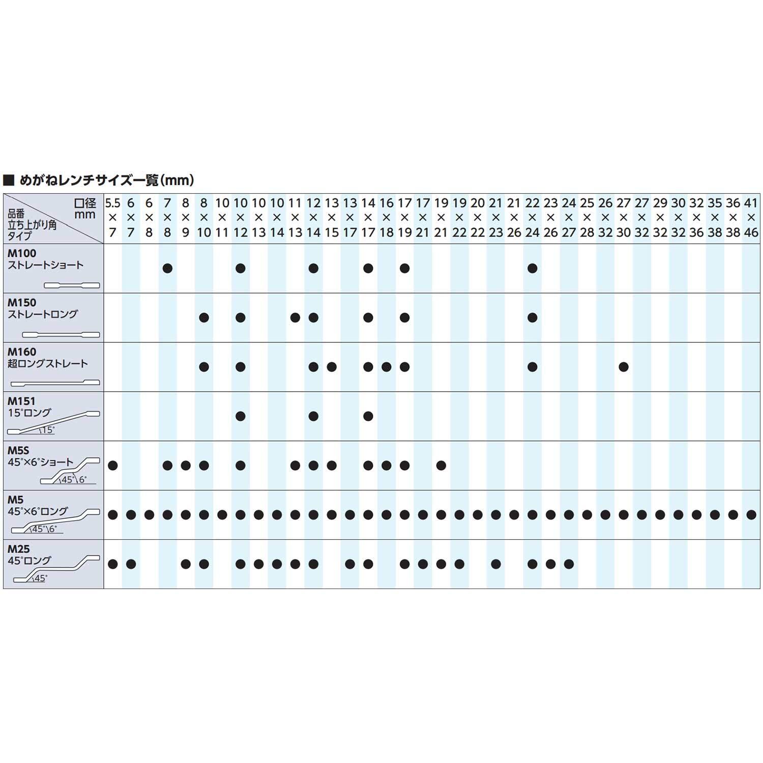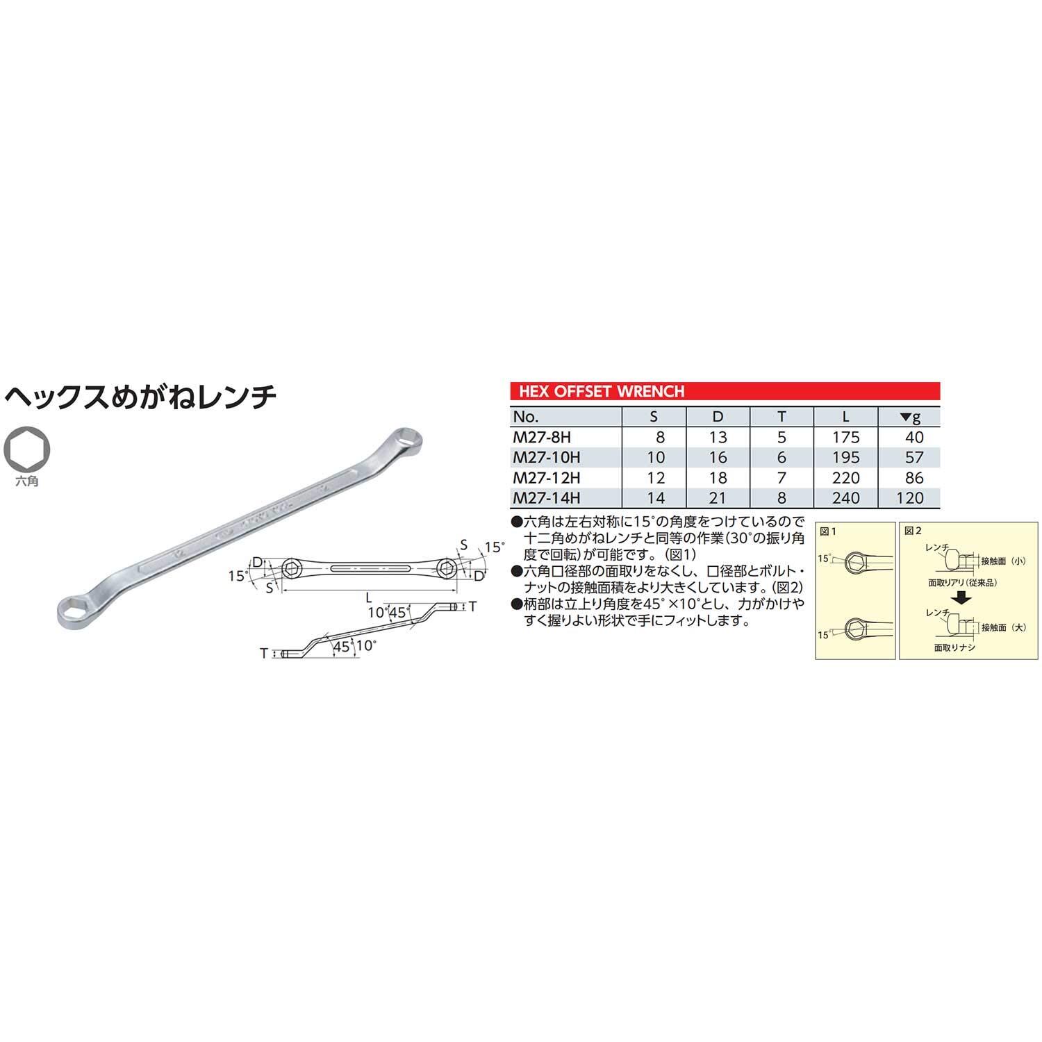 ●六角は左右対称に15度の角度をつけているので十二角めがねレンチと同等(30度の振れ角で回転)の作業が可能です。●六角口径部の面取りをなくし、口径部とボルト・ナットの接触面積をより大きくしています。●柄部は立ち上がり角度を45度×10度とし、力がかけやすく握りよい形状で手にフィットします。