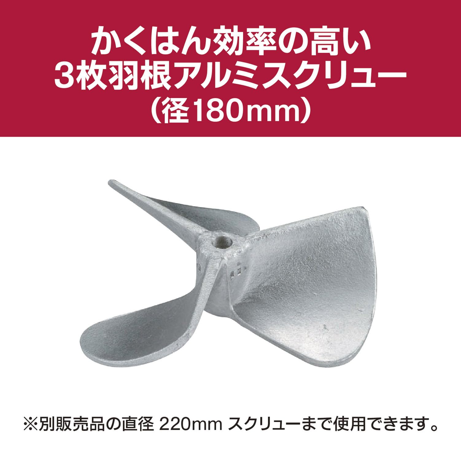 付属品:3枚羽根アルミスクリュー(径180mm)・ステンレスジョイント・防じんカバー・ステンレスシャフト(長さ500mm)・補助ハンドル・スクリュー取付ネジ・両口スパナ(10×13・17×19)・ナベ小ネジ(M4×10)・六角ボルト(M6×18)