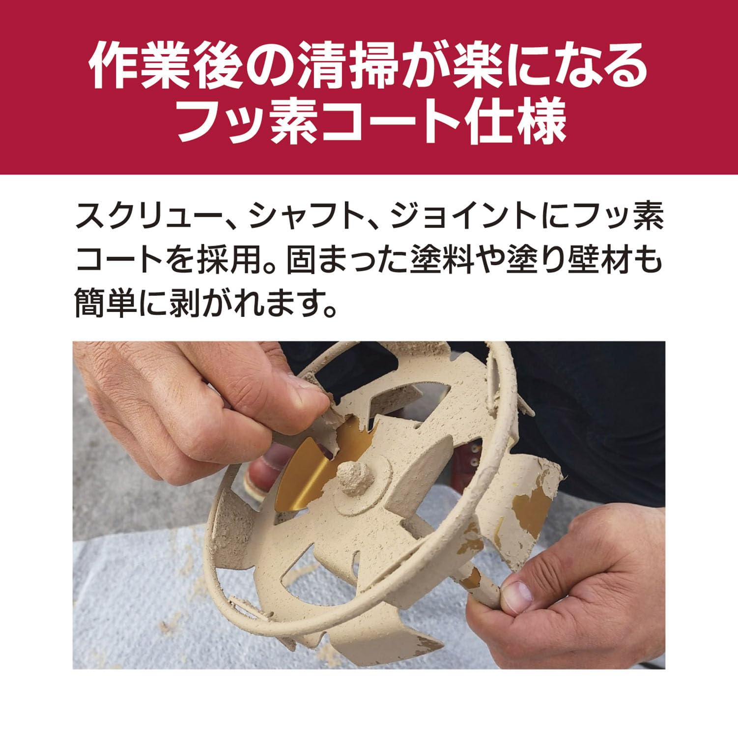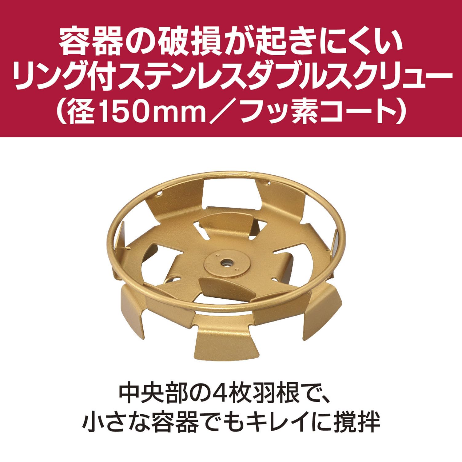 塗料が付着しにくく、はがしやすいフッ素コートのリング付ステンレスダブルスクリューを採用したパワーミキサー