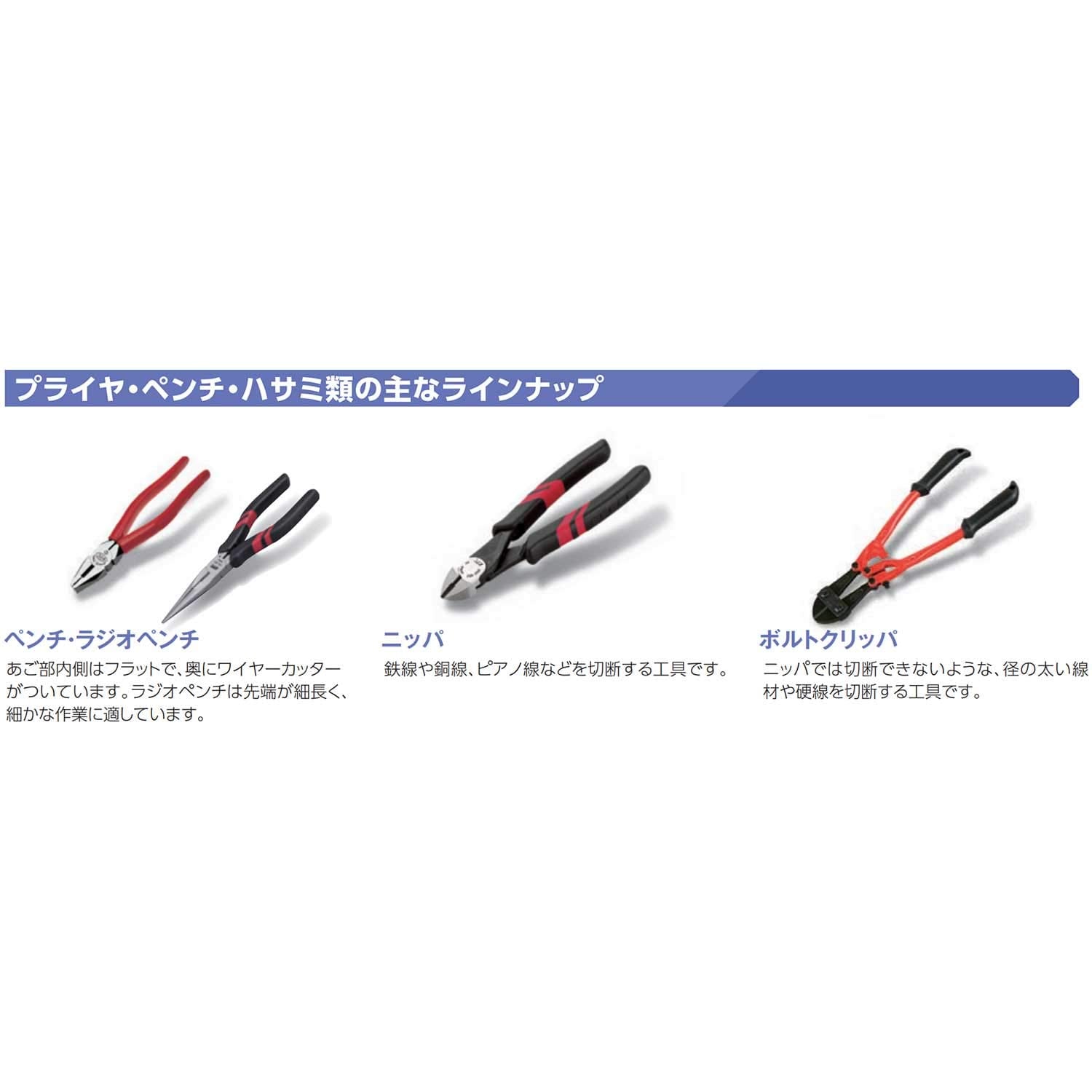 ●本体のカシメ部はガタ付きが少なく、開閉はばね付です。●クローが長いロングタイプなので、狭く奥深い場所で威力を発揮します。