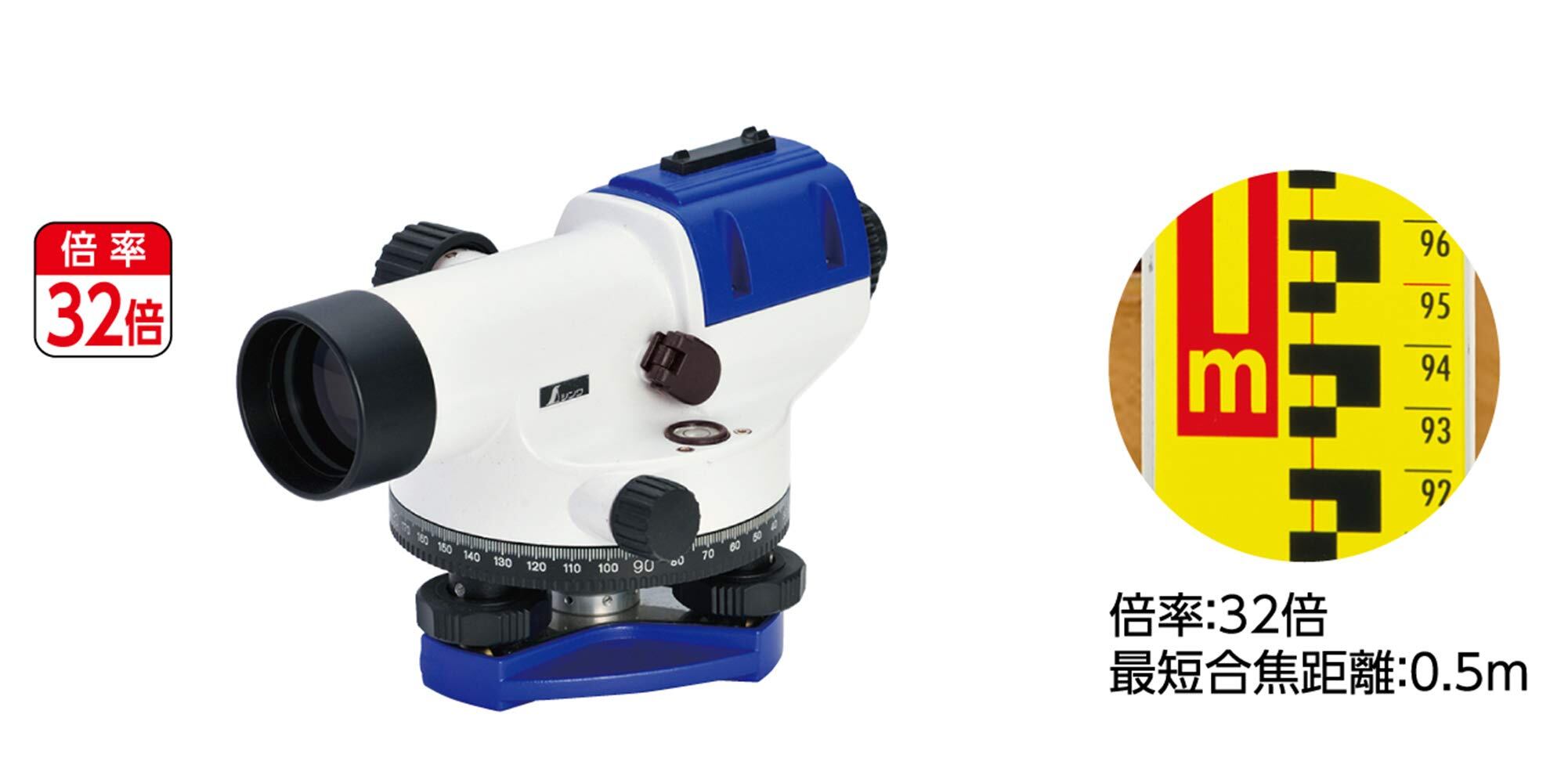 《仕様》 標準偏差:±1.0mm 望遠鏡:正像 倍率:32X 対物レンズ有効径:40mm 視界:1°30’ 最短合焦距離:0.5m スタジア乗数:100 スタジア加数:0 円型気泡管感度:8’/2mm 最小水平目盛:1° 自動補正機構:マグネットダンパー 繰り返し精度:0.3”