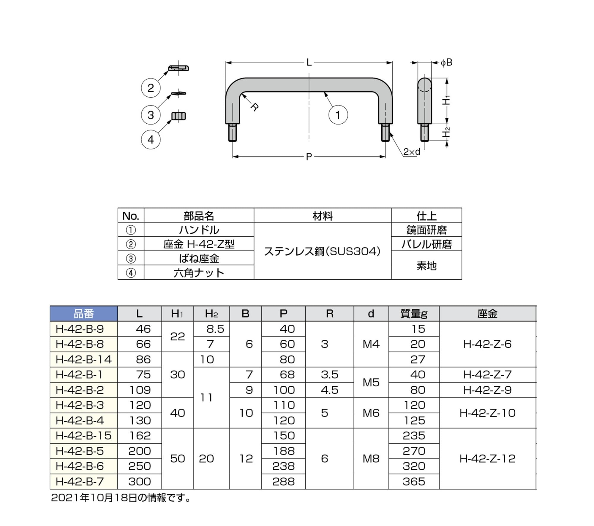 付属内容:ハンドル・ステンレス鋼(SUS304)鏡面研磨、座金H-42-Z型・ステンレス鋼(SUS304)バレル研磨、スプリングワッシャー・ステンレス鋼、六角ナット・ステンレス鋼