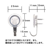 取付けられる所 ●石こうボート・プリント合板・板・木 取付けられない所 ●石こう吸音ボード・ロックウール吸音ボード ●しっくい・土壁のもろい壁 ●コンクリート・ブロック・レンガ等、かたい壁やタイルの目地 使用上の注意 1.針の先が鋭利にとがっております。ケガには十分にご注意下さい。 小さなお子様には決して触れさせないで下さい。 2.水平、斜め方向への荷重はお避け下さい。 垂直方向への荷重のみ耐荷重は有効です。 3.制限荷重はお守り下さい。 4.万一の為、壊れやすい物、貴重品は掛けないで下さい。 5.取付け後、強く揺すり動かすとゆるみますのでご注意下さい。 耐荷重:7kg カラー:クリア 入数:2個