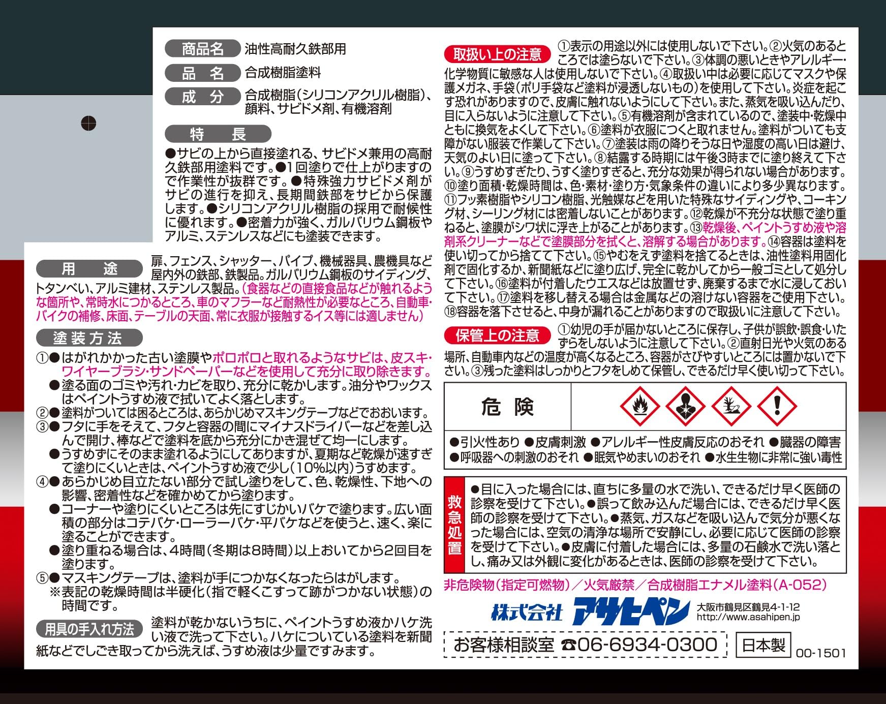 用途:(屋内外区分:屋内外用)扉、フェンス、シャッター、パイプ、機械器具、農機具などの屋内外の鉄部・鉄製品ガルバリウム鋼板のサイディング、トタンべい、アルミ建材、ステンレス製品。