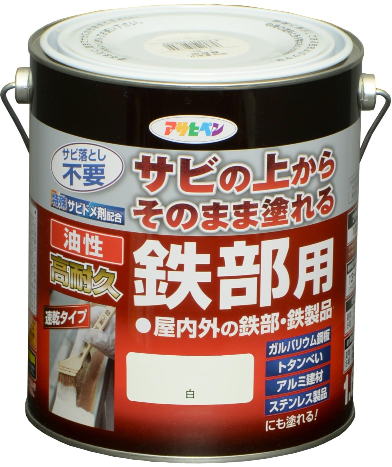 アサヒペン 塗料 ペンキ 油性高耐久鉄部用 1.6L 白 油性 サビの上からそのまま塗れる ツヤあり 1回塗り 高密着性 耐候性 日本製