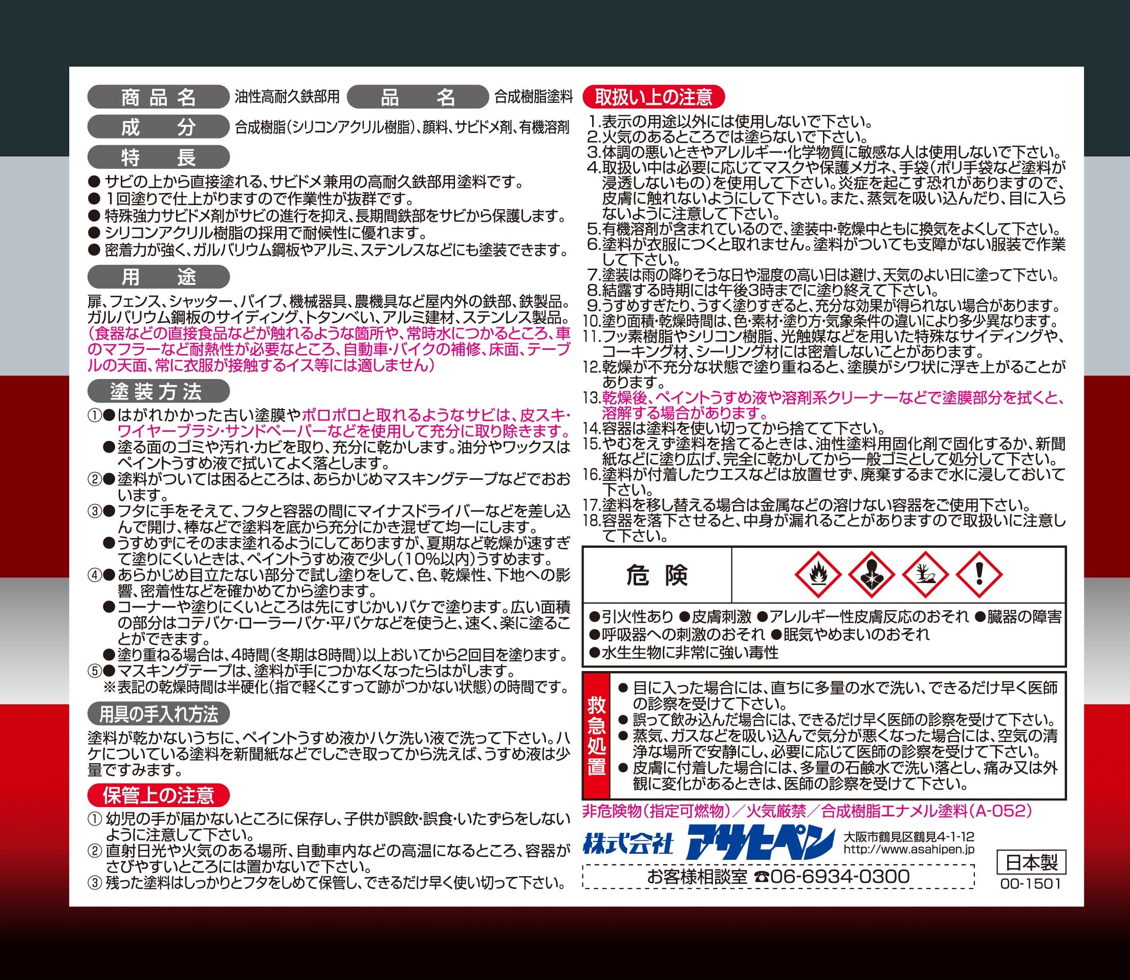用途:(屋内外区分:屋内外用)扉、フェンス、シャッター、パイプ、機械器具、農機具などの屋内外の鉄部・鉄製品ガルバリウム鋼板のサイディング、トタンべい、アルミ建材、ステンレス製品。