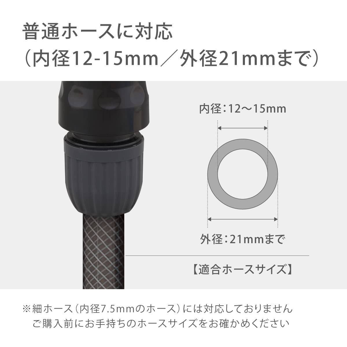 普通ホース(内径12-15mm/外径21mm)に対応。