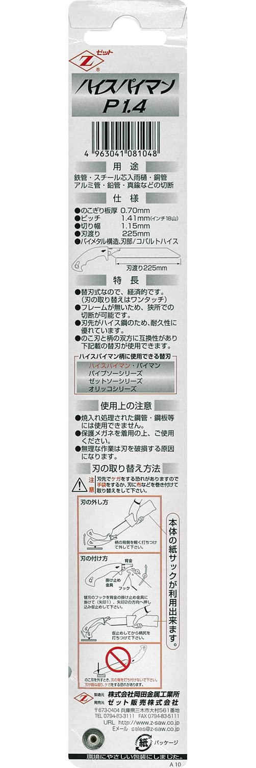 ゼット販売 Zハイスパイマン 金属切断用ノコギリ P1.4 08104