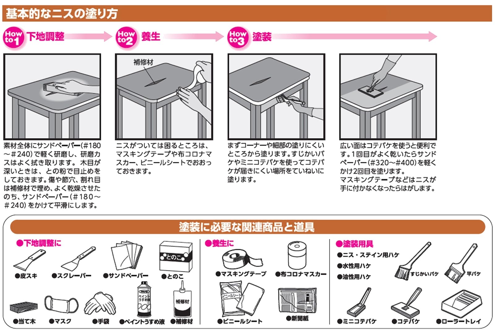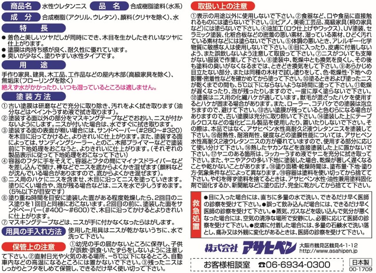 注意事項:●用途以外に使用しないで下さい。 ●食器など、口や食品に直接触れるものには塗らないで下さい。 ●ピアノ、美術工芸品、高級家具(桐の家具など)には塗らないで下さい。 ●油加工(ロウ仕上げやワックス)、UV塗装、セラミック塗装、化粧合板などの密着の悪い素材、湿っている素材、ひどく汚れている素材などには塗らないで下さい。 ●体調の悪いとき、アレルギー・化学物質に敏感な人は使用しないで下さい。 ●目に入ったり、皮膚に付着しないよう、また誤飲しないよう注意して取扱って下さい。 ●ニスがついても支障がない服装で作業して下さい。 ●塗装中、乾燥中とも換気を良くし、その後も塗料の臭いがなくなるまでは、ときどき換気をして下さい。 ●あらかじめ目立たない部分、または同種の木材で試し塗りをして、色・乾燥性・下地への影響・密着性などを確かめてから塗って下さい。 ●塗るときおよび塗ったニスが乾くまでの間も、5℃以下にならないような時間に塗って下さい。 ●乾燥が遅くなったり、泡が残ったりしますので、一度に厚く塗らないで下さい。 ●塗装はニス用の化繊ハケが適しています。獣毛が混ざったハケを使用するとハケが固まる場合があります。 また、ローラー、コテバケでの塗装は泡立ちますので、避けて下さい。 ●古い塗膜が残っていると色むらになる場合がありますので、古い塗膜は充分に取り除いて下さい。 ●塗装した上にテーブルクロスなどの塩化ビニル製品を使用したり、置いたりしないで下さい。 その際は、本品ではなく、アサヒペン水性高耐久2液ウレタンニスを塗装して下さい。 ●耐熱性、耐溶剤性、硬度などの塗膜性能については、アサヒペン水性高耐久2液ウレタンニスの方が優れていますので、使用する部分に応じて使い分けて下さい。 ●熱したヤカンなどを直接塗装した上に置かないで下さい。 ●ヤニのある箇所は、ラッカーうすめ液でヤニを充分に拭き取って下さい。 また、ヤニやアクの多い下地に塗装した場合、乾燥が著しく遅くなることや乾かないことがあります。 ●塗り面積・乾燥時間は、塗布量・下地・塗り方・気象条件などによって異なります。 ●容器は塗料を使い切ってから捨てて下さい。やむを得ず塗料を捨てるときは、アサヒペン水性・油性兼用塗料固化剤で固化するか、新聞紙などに塗り広げ、完全に乾かしてから捨てて下さい。