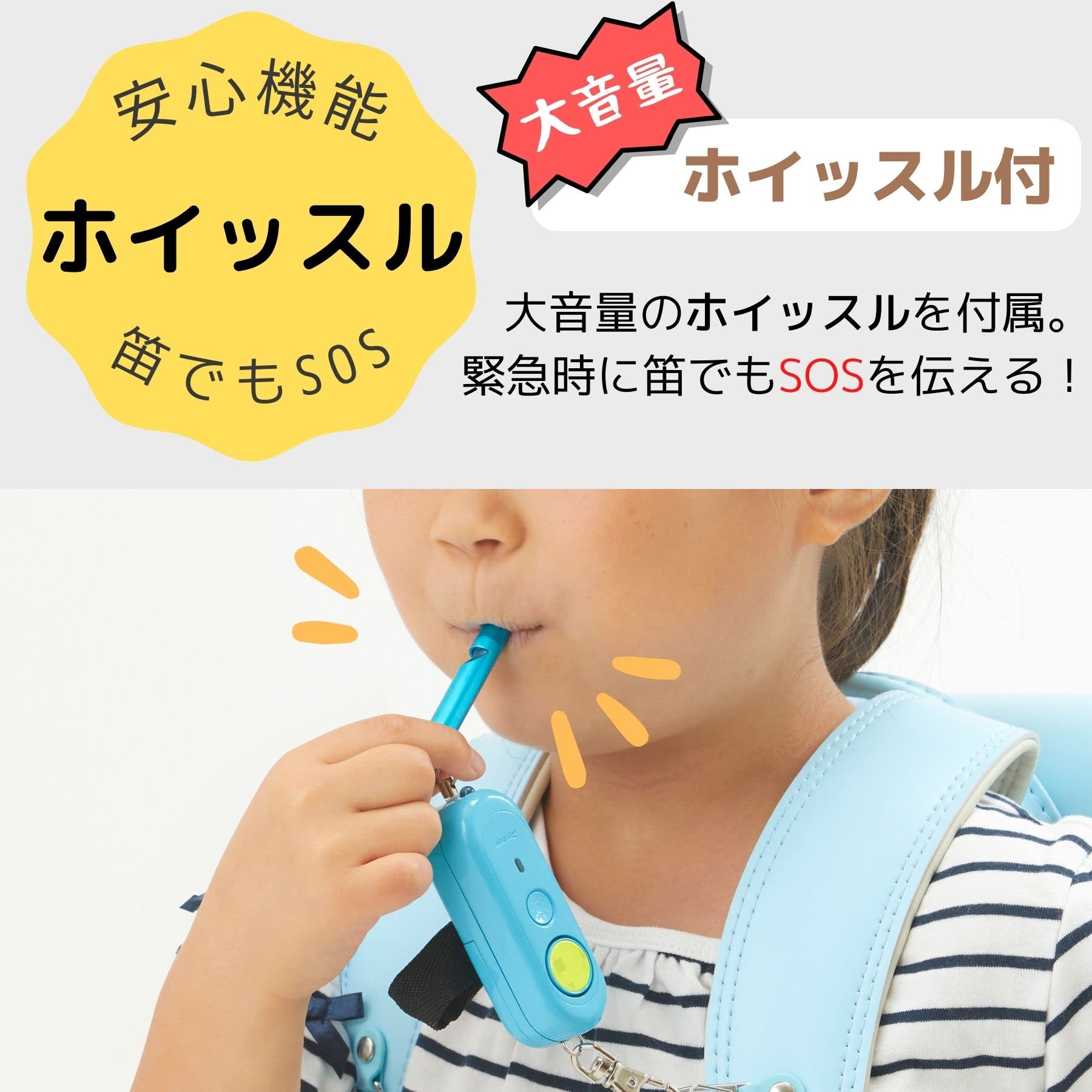 大音量で鳴るホイッスルがついた防犯ブザー。高レベルの防水防塵機能(IP64)。