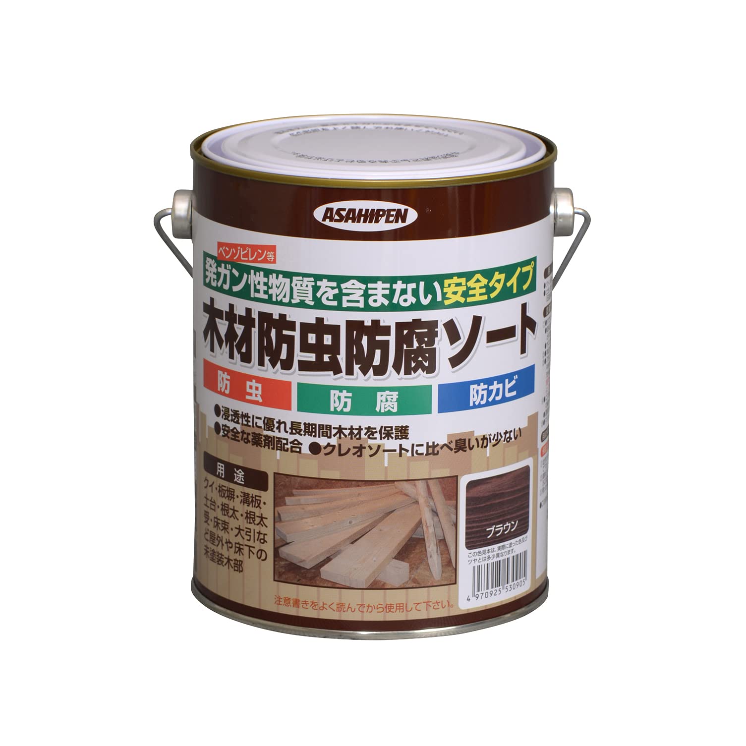用途:●クイ、板塀、溝板等の屋外未塗装部分の防腐、防虫。●土台、根太、根太受、床束、大引などの床下未塗装木部の防虫・防腐。