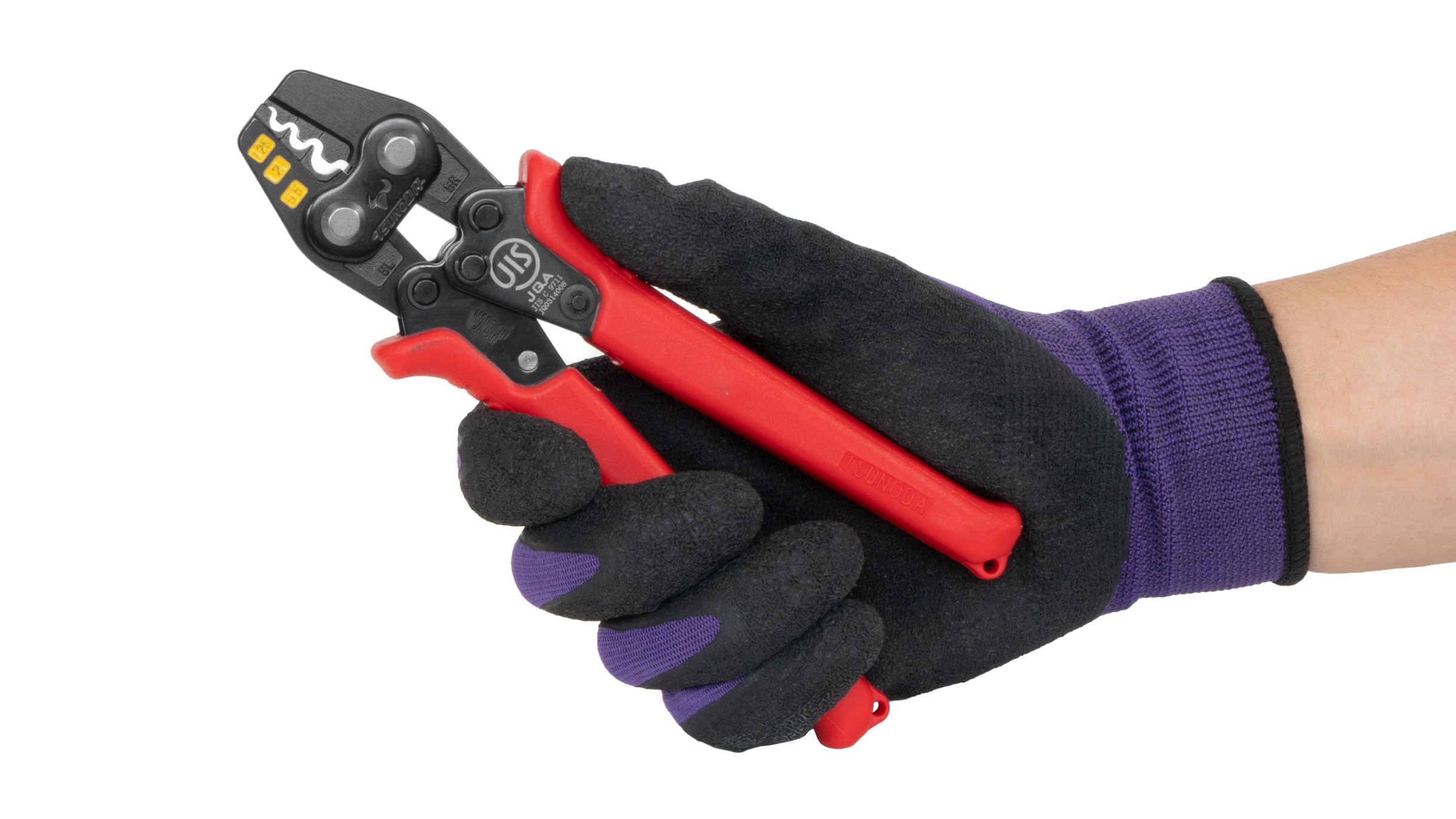 業界NO1の軽量コンパクトな圧着工具。構造力学計算によって倍力率を高めたトグル機構により、小さくても楽に圧着ができ負担を軽減します。またギア数を細かく設定したことで仮押さえ時の端子のつぶれを軽減し電線挿入作業をスムーズにします。圧着マークはくっきりと刻印がされるように最後まで確実に圧着をしてからハンドルが解除される仕様。安心の日本製。出荷前に全丁検査を実施し、パッケージに検査証を封入。