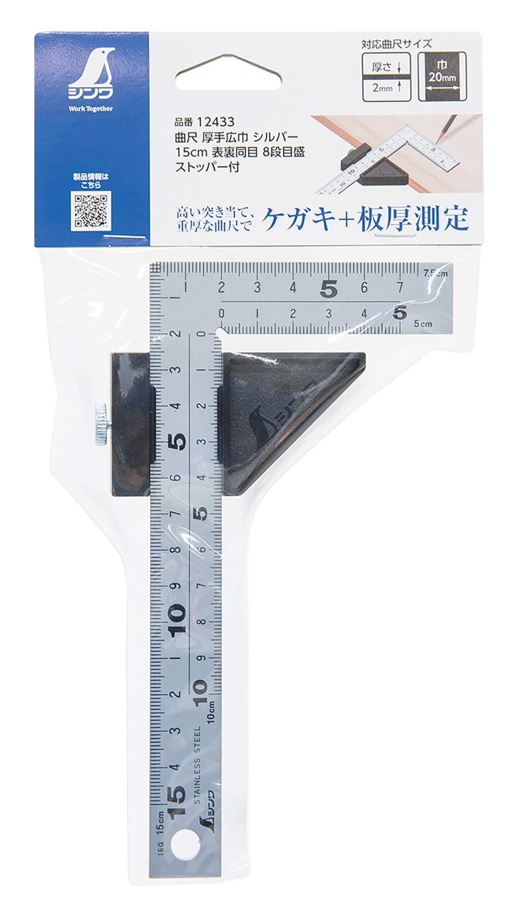 シンワ測定(Shinwa Sokutei) 曲尺厚手広巾 シルバー 15cm 8段目盛 ストッパー付 12433